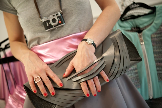 Nekem nincs hétvége, és a hét bármelyik napja végződhet az éjszakában. Ma rövid napom volt a showroomban, már az esti buli szettben érkeztem. A szoknya a metál hatású derékrésznek köszönhetően eléggé feltűnő még a sötétben is, ezért szeretek benne a budapesti éjszakában jönni-menni. A nyakamban lógó kis ékszer egy igazi működő fényképezőgép, amit inkább kiegészítőként viselek, mert mindig elfelejtem feltölteni. A táskám Siető Linda korai korszakából való, azonnal beleszerettem annak idején a különleges és egyedi koncepciójába, volt egy közös bemutatónk meg jó pár éve, akkor cseréltünk egymással ruhát táskára, azóta fontos darabja a ruhatáramnak ez a szürke clutch.