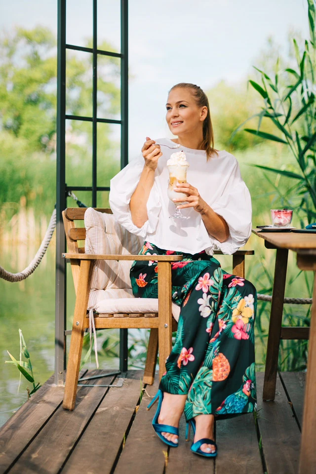 Havonta egyszer összeülünk a mindig csinos baratnőimmel egy ebédre, kávéra, süteményre vagy csak egy borra, hogy megbeszéljük kivel mi történt! Hogy ne lógjak ki a sorból, ezt a hawaii hangulatú elegáns nadrágot valasztottam a Mohitoból, és egy buborékvállú blúzt, amit még egy thai tervező készített nekem. A kék vékonypántos bársonycipellő a Deichmannból van.