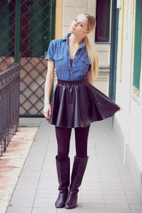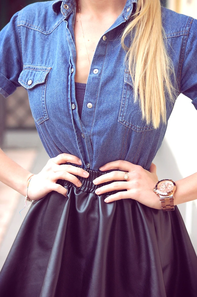 Régebben idegenkedtem a bőr hatású ruháktól, legyen szó nadrágról vagy szoknyáról de mostanában sok külföldi divatoldalon láttam hasonló összeállítást, és azt hiszem, a bohém rövid ujjú farmer ingtől elveszti a domina-hatását :)