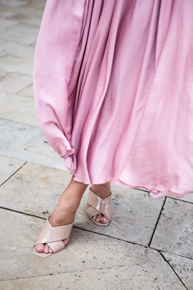 Ma a Sloggi kampány fotózása előtt gyorsan beugrottam anyagot válogatni. Nálam egy kollekció összeállítása mindig az anyagokkal kezdődik, szeretek a különböző textilekből inspirálódni. Az egyik kedvenc belvárosi textilboltomban Special-Tex-ben éppen a következő őszi kollekcióhoz nézelődöm. Ez a mályvaszínű ISAAN ruha abszolút kedvencem, mert nagyon kényelmes és nőies viselet egyszerre, illetve az anyag esését is nagyon szeretem! Ezt lakk kiegészítőkkel párosítottam.