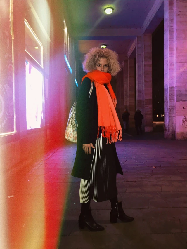 Télen rengeteg gyapjút hordok, mert nagyon fázós vagyok. A pliszirozott szoknya az egyik kedvencem, mert ahogy mozog benne a viselője izgalmas vizuális hatása van. Az Opening Ceremony táskába meg minden belefér ami egy naphoz kell. A kabát egy kísérleti darab, én varrtam kézzel.