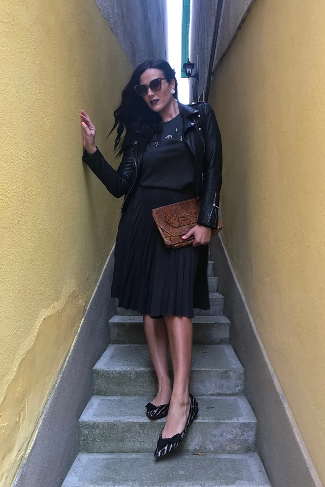 Itt éppen egy megbeszéléshez választott, nőies szettben kapott szerepet a fekete Zara dzseki, amihez szintén remekül passzol. Ez a kis bőrhatású vintage táska pedig jól feldobja az egyébként fekete tónusú összeállítást.