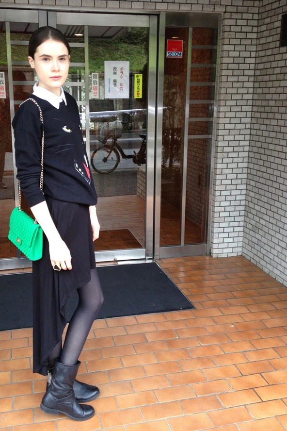 Egy viszonylag korai kelés után, a kedvenc pulcsimmal próbáltam felrázni magam, amely alá egy galléros fehér pólót is párosítottam. Imádom a fekete-fehér pulcsi, gallér kombinációt.. Egy átlagos szettet is kitűnően feldob, különlegessé tesz. Amint említettem a tegnapi outfittemmel kapcsolatban, a farmer nem tartozik a kedvenceim közé.. Így ma a szokásomhoz híven egy elöl rövid, hátul hosszú fekete pamut szoknyát viselek, a Bershkából. Cipő terén Steve Madden egyik darabja mellett döntöttem. Kiegészítőként Tokió legőrültebb kerületében beszerzett műanyag táskát választottam, egy Ruffian gyűrűel. Indulhat is a keddi nap! :)