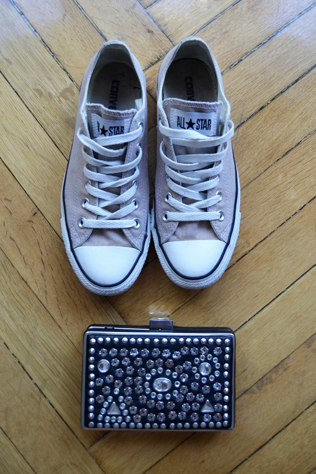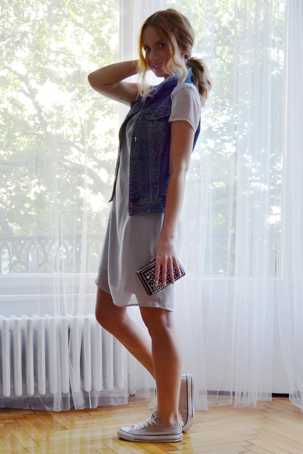 Az egyszerű szabású, egyszínű ruhák remekül kombinálhatóak, egy magas sarkú szandállal akár esküvőre, vagy rendezvényre is megállja a helyét, a tornacipőnek és farmermellénynek pedig remekül ellensúlyozza a maszkulinitását. A táska pedig... hát én olyan nő vagyok, aki ebbe is belefér. Telefon, kulcs, bankkártya, zsebkendő, szájfény. Ezen kívül csak napszemüveget, és egy legyezőt cipelek magammal.