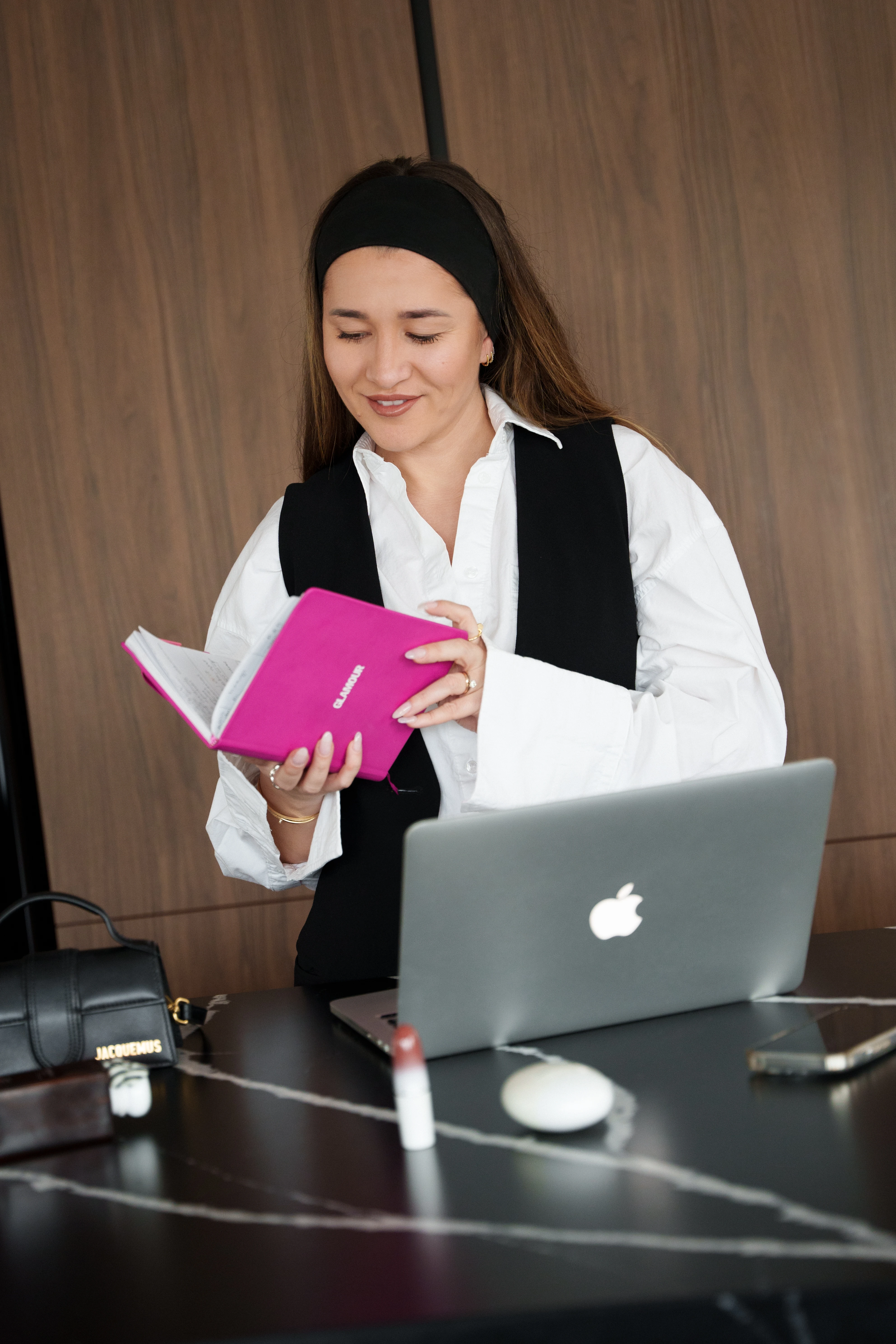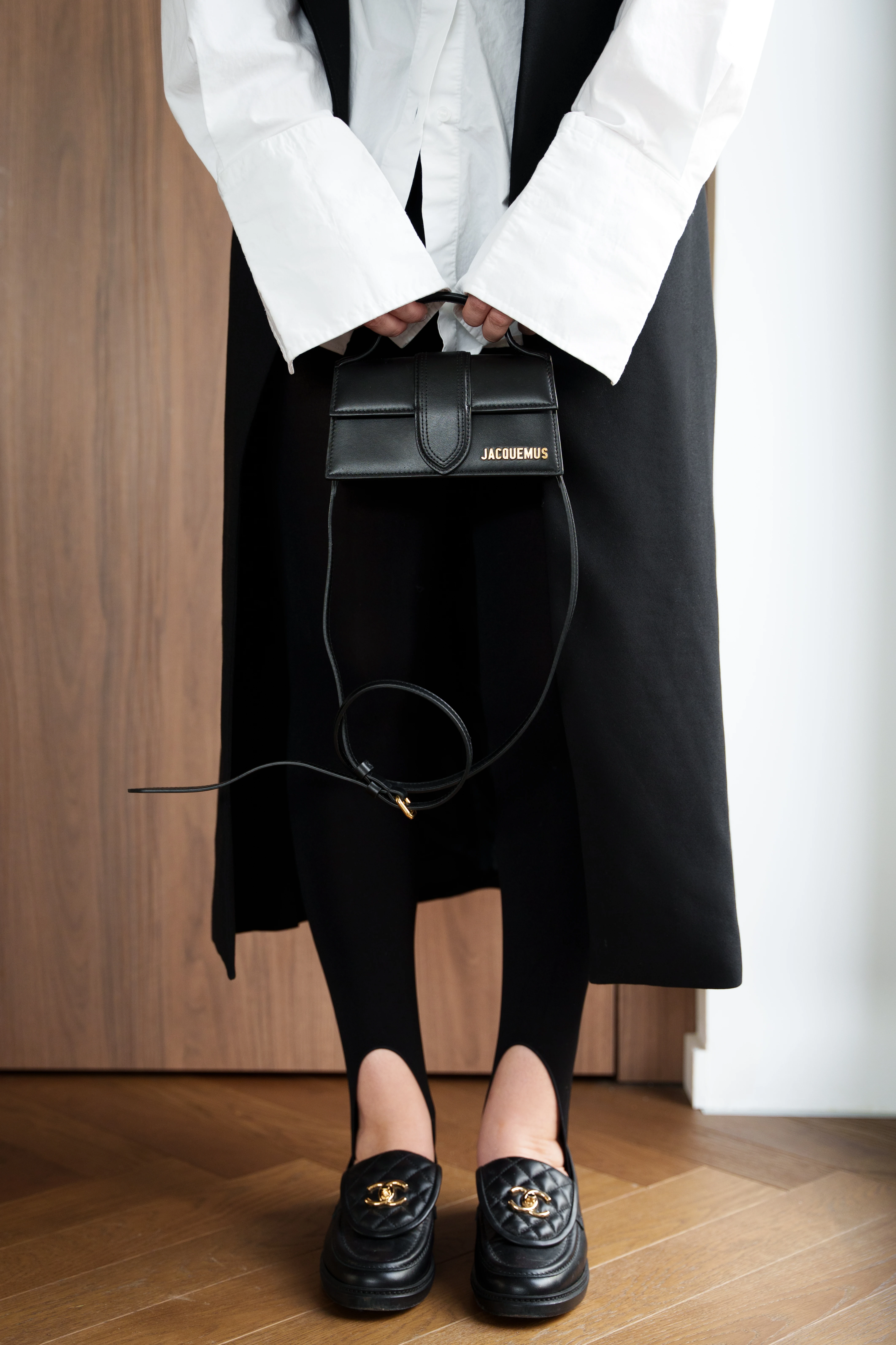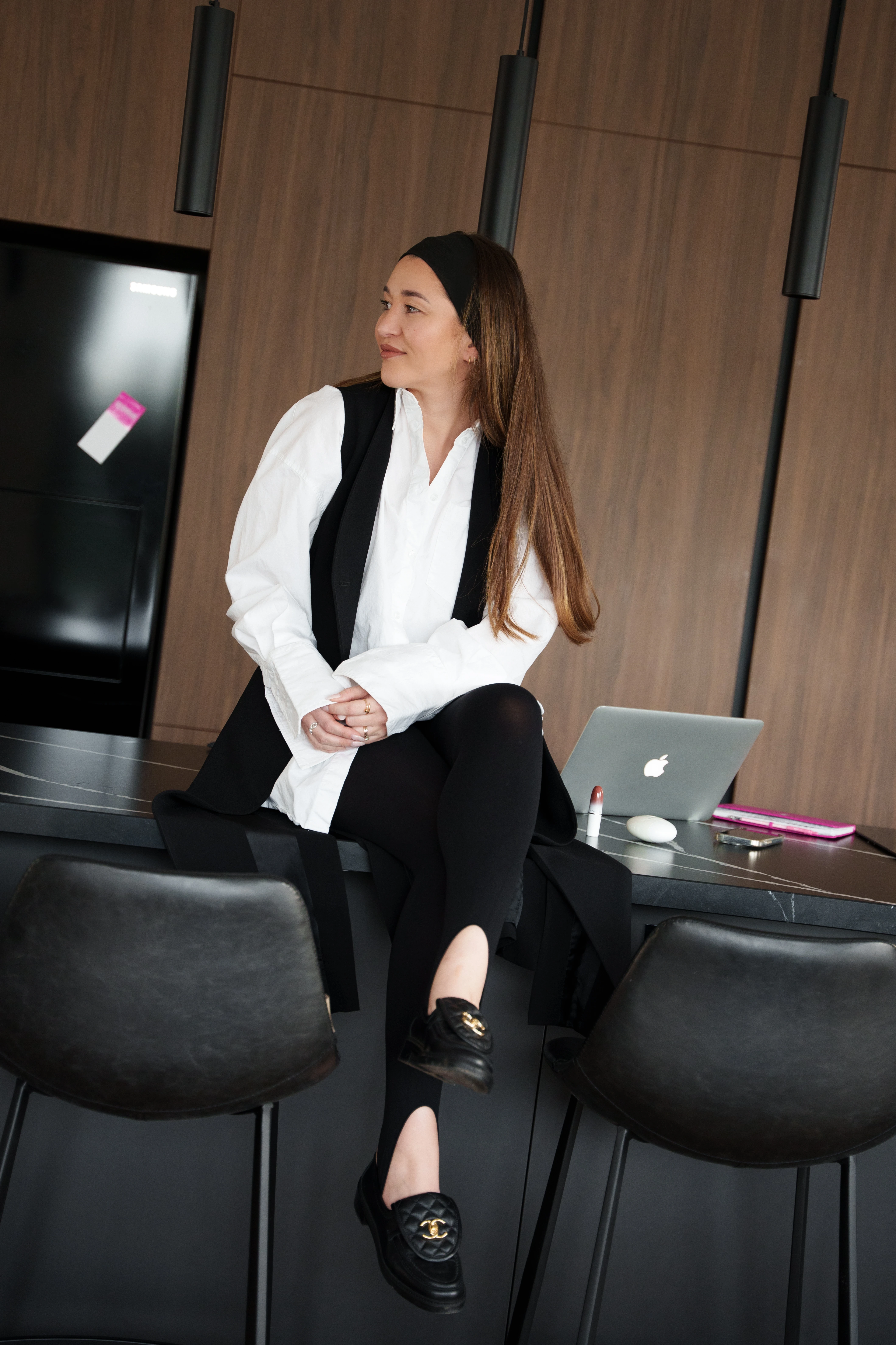 „Idén a mellények reneszánszukat élik, ezért egy hosszított verziót választottam az ing mellé, és egy talpalós leggings-et loaferrel. Kényelmes, ugyanakkor formális a megjelenésem, ami elengedhetetlen a business meetingekhez. A ruhatáram részét alkotják a mini táskák, tudom ezekbe nem a legpraktikusabb pakolni, viszont az egyszerű szetteket iszonyatosan jól feldobják. Nem utolsó sorban fantasztikus beszélgetésindító egy új társaságban!”