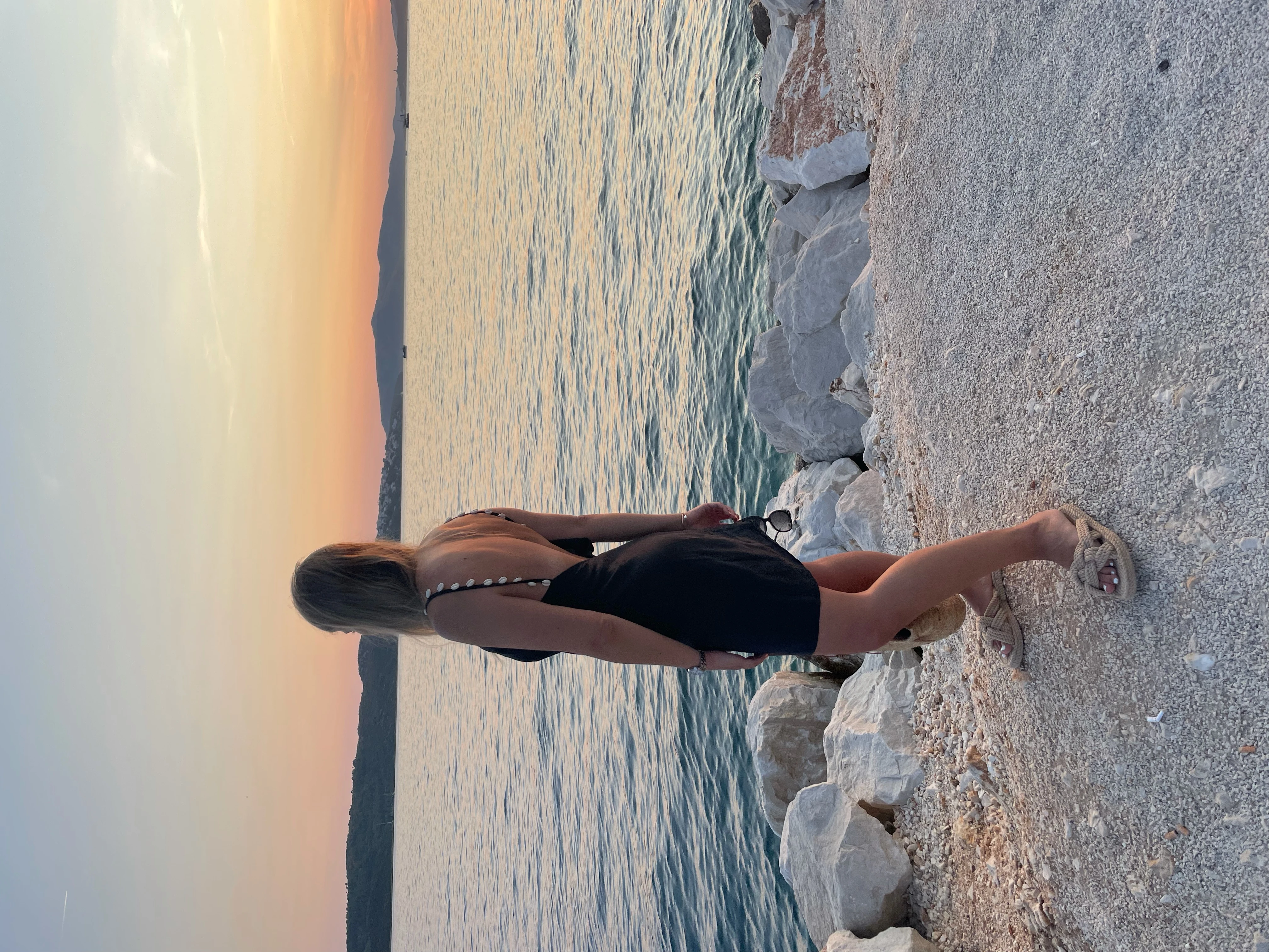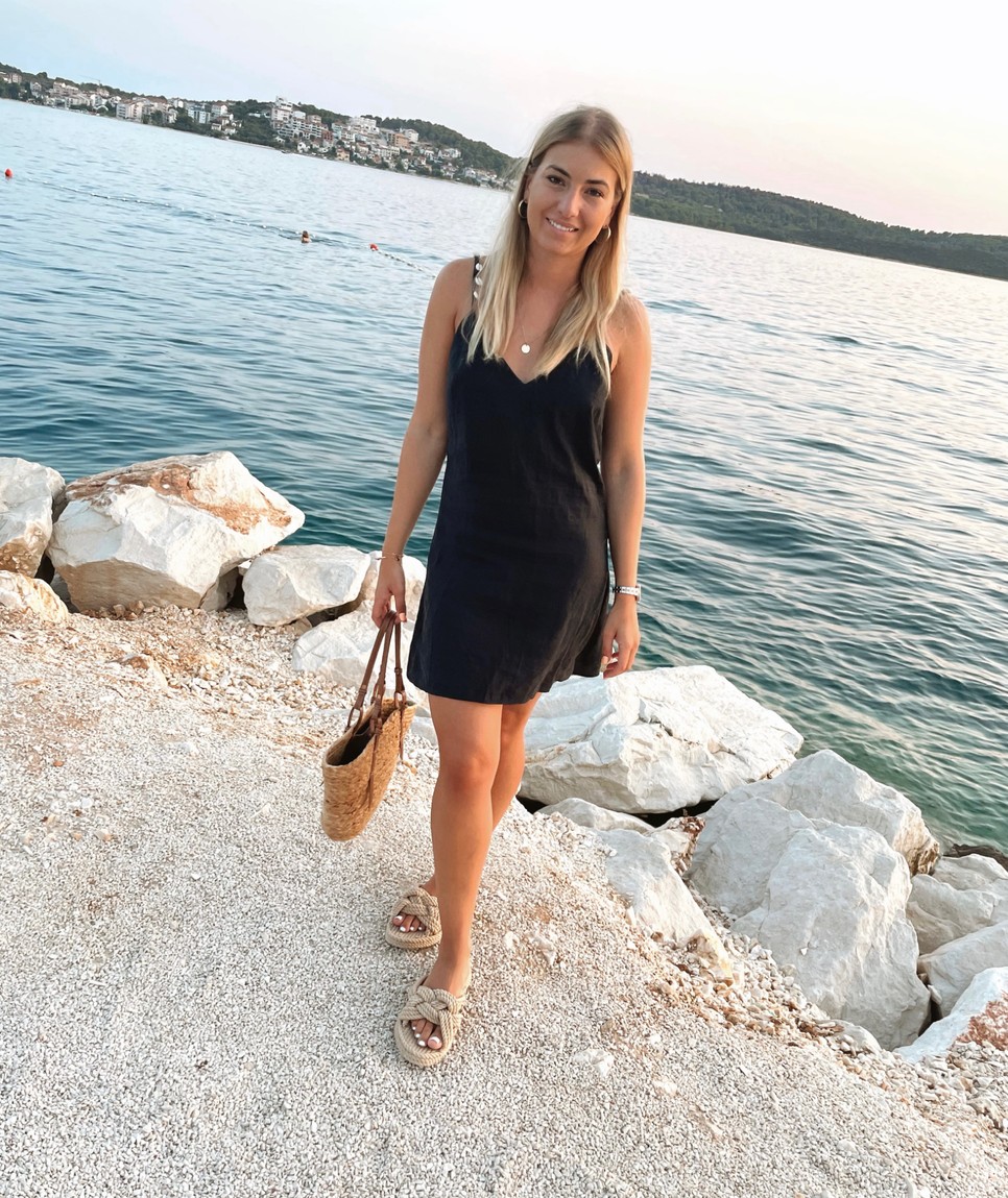 Ismét Horvátország partjáról jelentkezem, az egyik legkedvesebb idei nyári darabommal, ezzel a lenge fekete ruhával, ami tökéletes egy laza nyári meleg naphoz, de magassarkúval meg nagyon szépen mutat egy elegánsabb estéhez is. És mint látjátok nem hazudtam, nagyon kedvelem a fonott kiegészítőket, mint ezt a papucsot is, ami első látásra szerelem volt.
