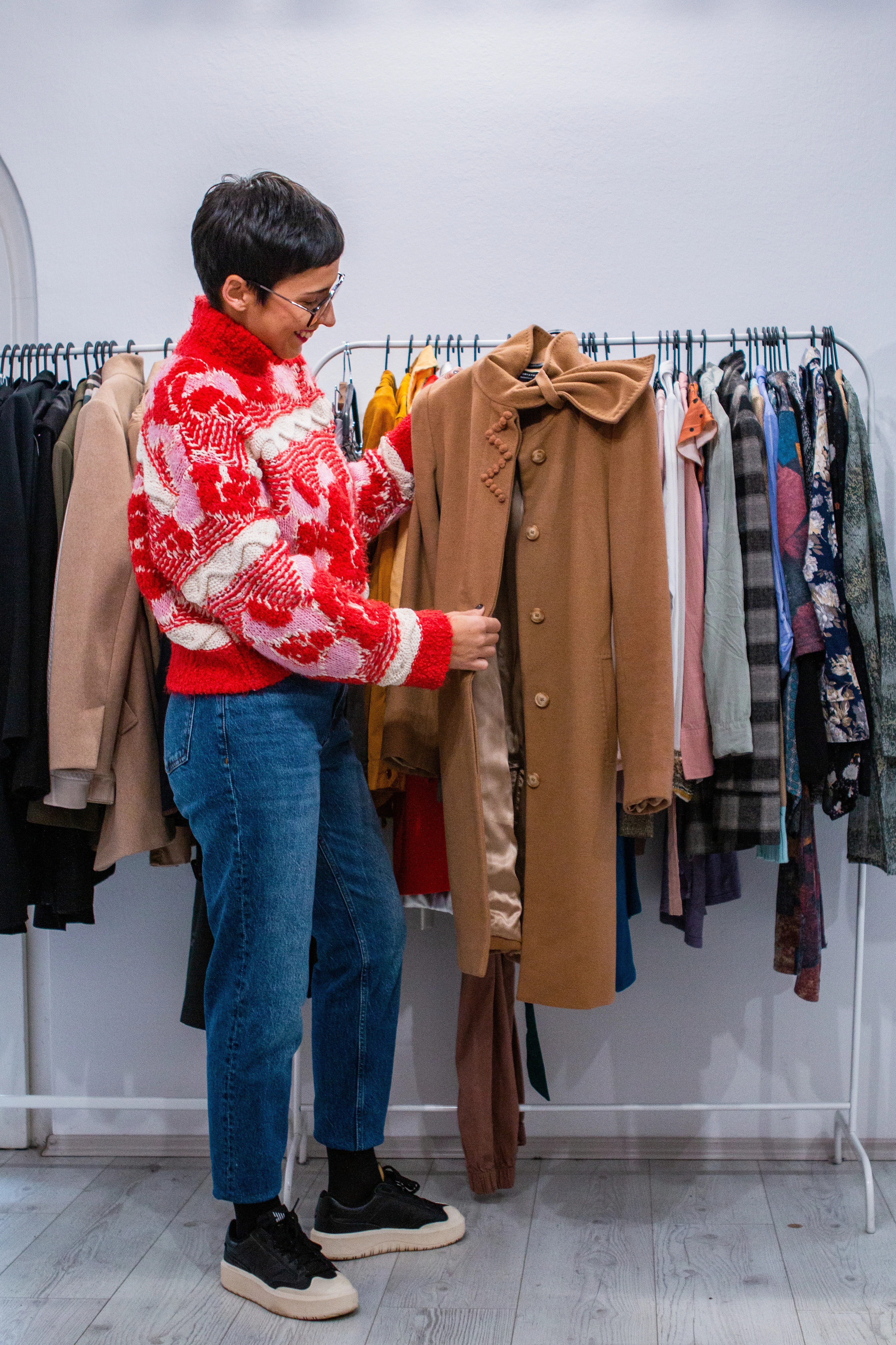 Kovács Delinke vagyok, személyi stylist, vállalkozó. Öt éve foglalkozom személyi stylinggal és emellett 2,5 éve vagyok egy secondhand boltnak, a Reusednak a tulajdonosa. Annak ellenére, hogy nap, mint nap ruhák között vagyok, már nem csábulok el egy-egy új darab láttán. A saját ruhatáramban nem szeretem a halmozást. Szekrényemben sok secondhand kincs és magyar márkák ruhái, kiegészítői is megtalálhatók. Fontos számomra a jól kombinálhatóság, hogy egy-egy darabnak minél több arcát lássam meg. Az Instagram oldalamon is igyekszem ezt átadni, és a vendégeimet is erre ösztönzöm. Bár a ruhák terén tudok megálljt parancsolni magamnak, a cipők esetében ezt már nem tudom elmondani. Abszolút kedvenceim a sportcipők, de azért egy-két nőies darab is van a polcaimon.