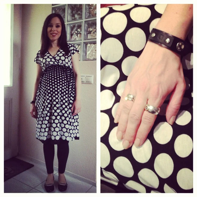 Ma sajtótájékoztatóra rohanok, utána még egy rádióinterjú vár rám, és rengeteg elintéznivaló az új, Vulkán c. szólólemezem kapcsán. Amikor felvettem a ruhát, a férjem rámpillantott, és azt mondta:" Hű, de csinos vagy! Mint egy pöttyös diszkógömb." Na, jóóóóóóóóó...nevettem. Elegáns, mégis kényelmes, és szellős, nagyon szeretem ezt a ruhát, persze ez is Hellobaby darab. Leggings és Topshop balerinacipő párosult hozzá. Általában nem hordok sok ékszert , csak a számomra meghatározó 3 gyűrűt:jegy-és karikagyűrű, és egy kedves emlék az egyik unokatesómtól. Ezt a fekete Doridea karkötőt gondoltam hozzá.