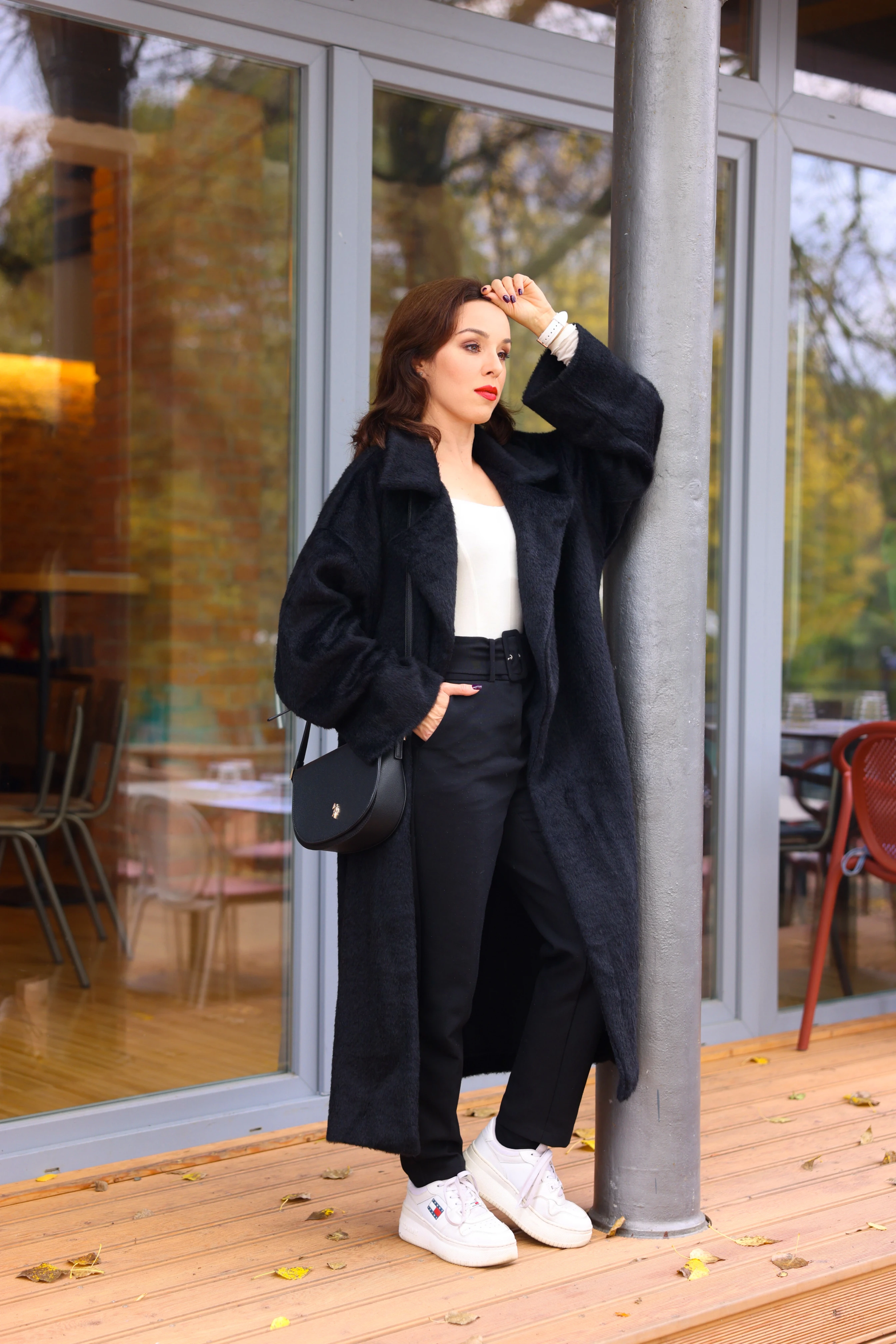 „Nagyon szeretem az oversize kabátokat, pláne ebben az időszakban. A mai szettem meghatározó darabja, alá egy fehér body-t vettem és a kedvenc nadrágomat, ami derékban övvel záródik. Kedvelem a sportcipőket, általában ilyeneket hordok, ha épp nem színpadon vagyok. Általában táska is van nálam, vagy hátizsák, notesszel, telefonnal, kottákkal."