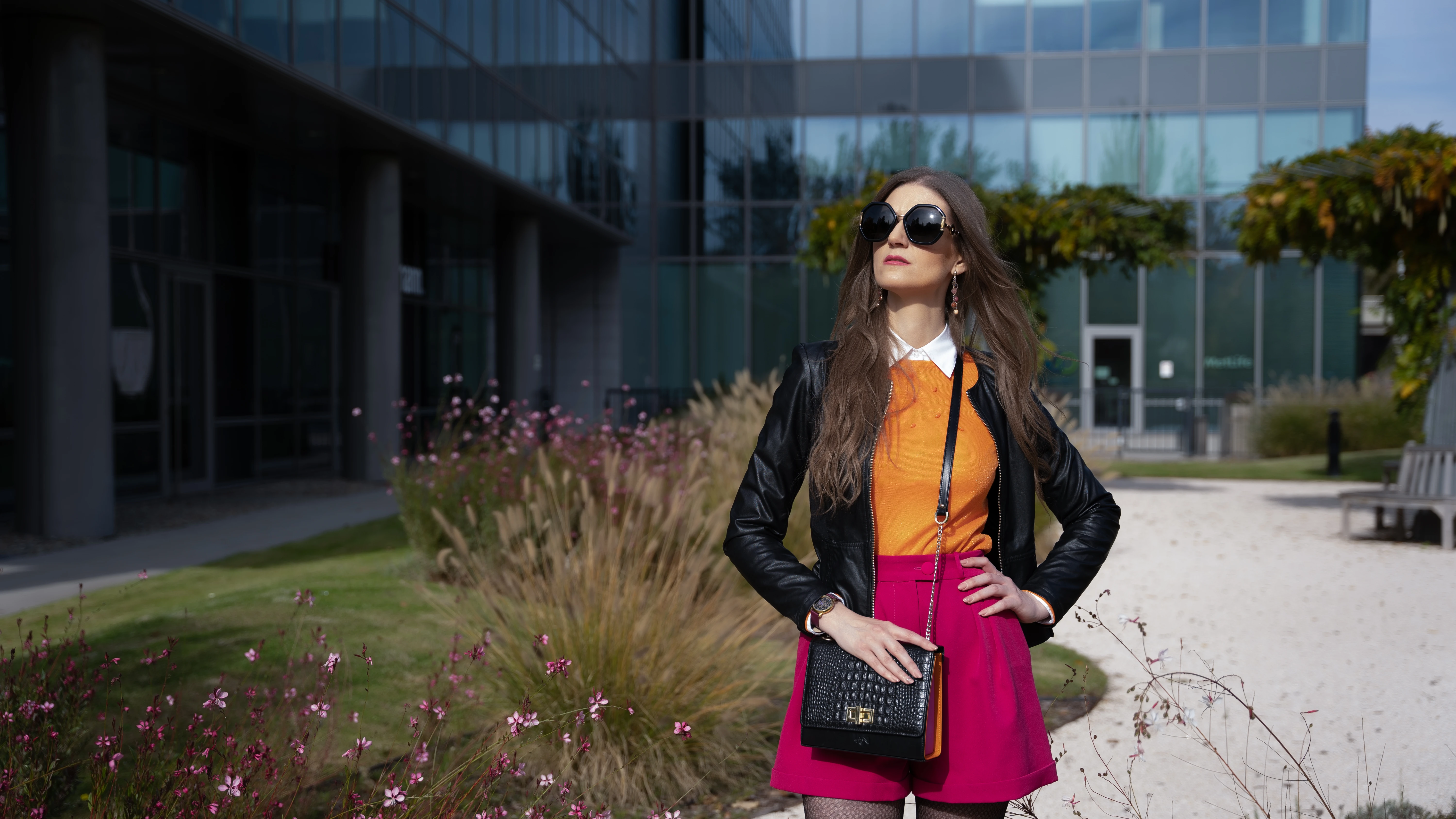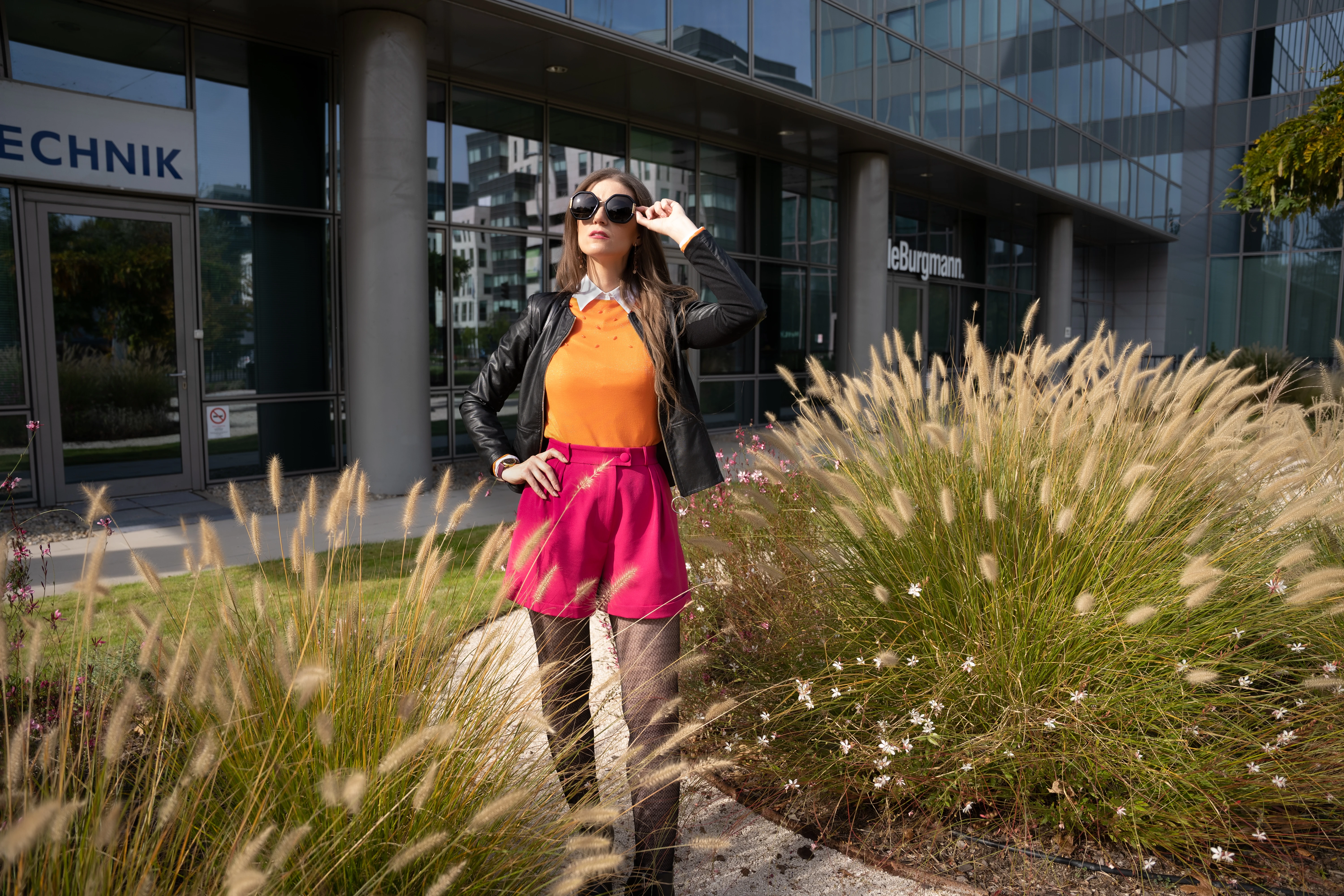 Kabát: Rinasscimento; Fehér blúz: Hugo Boss; Narancs felső, pink rövidnadrág és fülbevaló: VIKTORIAVARGA BUDAPEST; Bokacsizma: KAZAR; Táska: LAONI; Karóra: EVOLVENS; Harisnyanadrág: Calzedonia; Haj: BAM Beauty