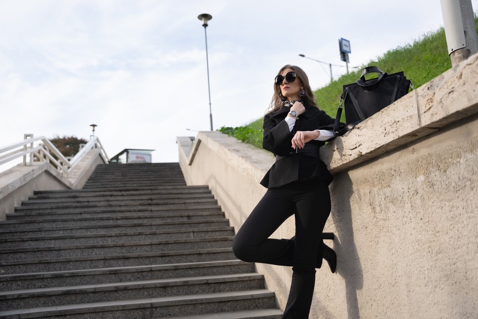Kabát: ALEXANDRA VAJDA; Nadrág és blúz: Massimo Dutti; Selyemkendő: silk&more; Napszemüveg: Versace; Fülbevaló: redrouge.hu; Bokacsizma: KAZAR; Táska: Vengru; Karóra: EVOLVENS; Haj: BAM Beauty