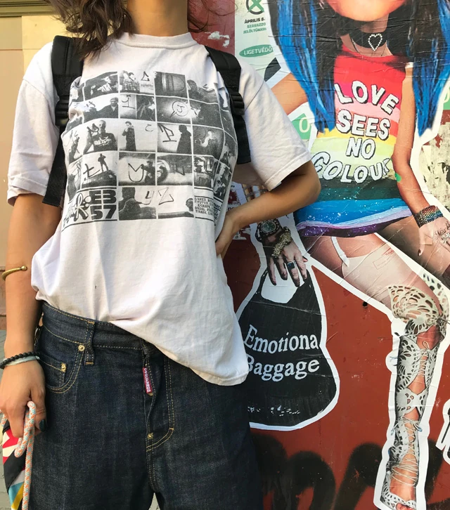 Póló: a barátom pólója és az az érdekessége, hogy az ABC betűi 1-1 graffitist jelölnek, mindegyikük nagyon kedves barátunk és a pólót magát is két jóbarátunk készítette, Blik Dani grafikus és E357 Miki fotós