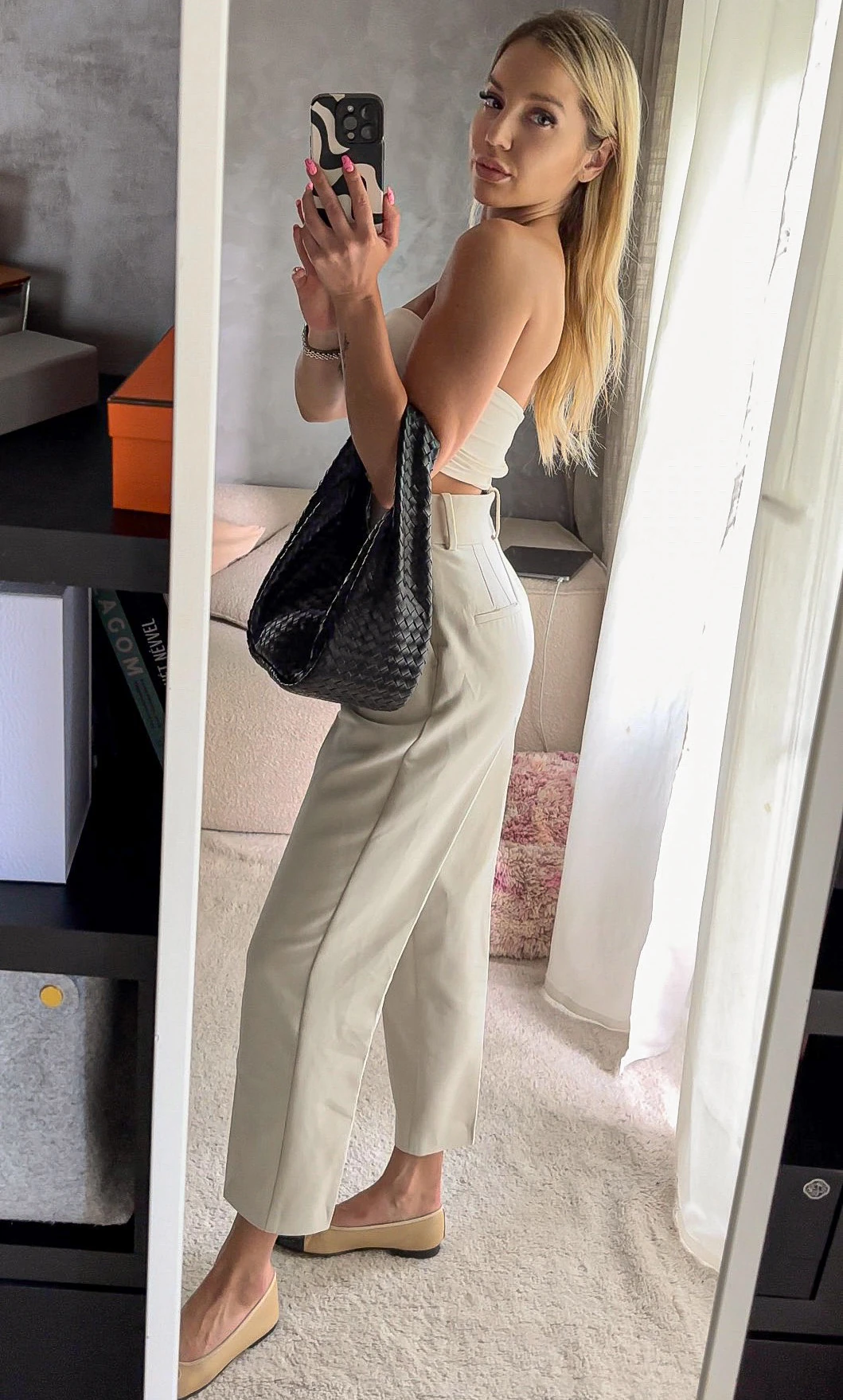 Ma egy üzleti előadásra megyek, így a kicsit "hivatalos-elegáns” vonalat képviselem. Szeretem ezt a Zara élére vasalt nadrágomat, övvel kifejezetten elegáns, ám öv nélkül, sneakerrel is fel szoktam venni, pólóval betűrve, és akkor kicsit lazább stílusa van. Nagyon gyakran hordok pánt nélküli topokat, mert szeretem így kihangsúlyozni a vállaimat. A Chanel cipőmet Vestiaire-ről rendeltem, ami egy “használt designer termékeket árusító oldal”, ám ez a cipő vadonatúj volt, csak a régi tulajdonosa nem hordta előtte, így eladásra kínálta. Ezen sokat spóroltam, és nagyon meg is érte, ugyanis brutálisan sokat hordom, szerintem ez az a típusú cipő, ami szinte mindenhez passzol… és nagyon kényelmes is. A táskám kicsit Bottega Veneta hatású, ám egy olcsó “dupe”. Nagyon nagyon szeretem, mert minden elfér benne, és jól meg is tudom tömni. Vállon és karon hordva is tökéletes. Az egyik kedvenc táskámnak mondanám.