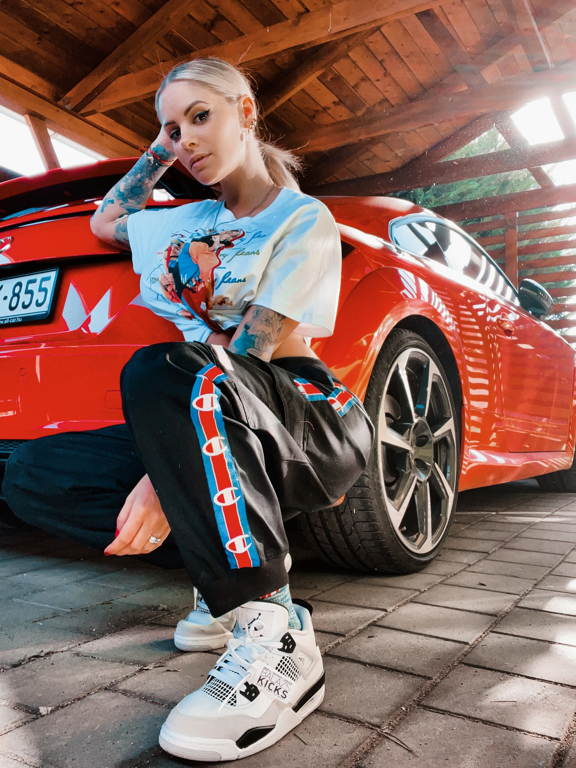 Egy DJ-nek általában a hét első napja jelenti a pihenőnapot, bár nekem ez is kivétel, hiszen a Rádió1-en vezetek műsort minden hétfő este. Ilyenkor szeretek lazán és kényelmesen menni a stúdióba, kedvelem a színes, de vagány, esetleg limitált kiadású darabokat. A lánybandás, zenekaros pólók nagy kedvenceim már jó pár éve, ilyen például ez a Tommy Jeans & TLC kollabos felsőm is. Mellé egy színben passzoló Champion nadrágot választottam, ami egyébként farmer anyag, mégis laza hatású és nagyon vagány. Ami a cipőket illeti: a Jordanek az abszolút kedvenceim: kényelmesek és a kedvenc fellépős sneakereim is.