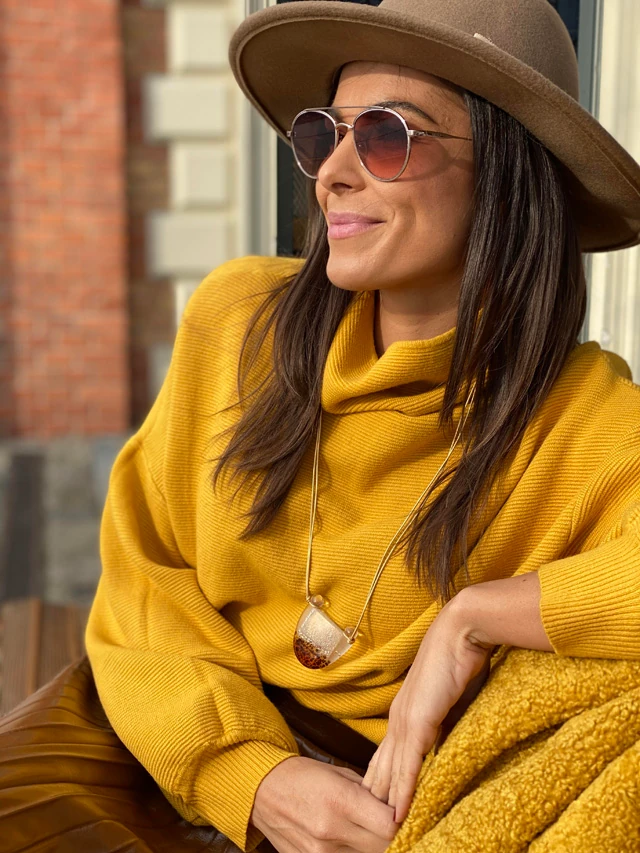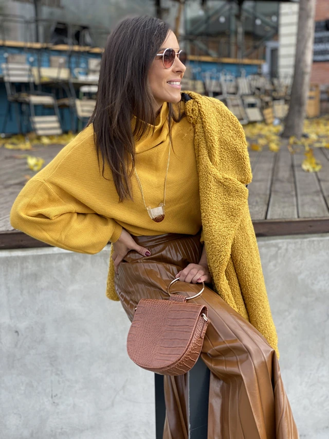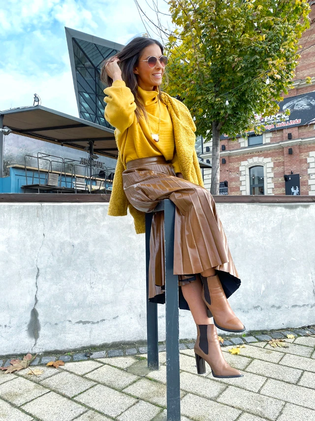 Titkolni se tudnám, hogy a pliszírozott szoknyák iránti rajongás engem is elért. Kifejezetten szeretem a barnát a mustárságával variálni, úgy érzem, hogy ez az én színkombinációm és jól is érzem magam benne. Ezt a szettet egy különleges, barnás színvilágú üvegszerű bizsuval dobtam fel. Számomra nagyon bejön, amikor a laza pulcsit szoknyával variálják, szeretem ezt a kombinációt, ahogy ennek a teddy kabátnak a puhaságát is. Régóta kutatom azt a kalapot, ami jól áll és számomra is komfortos.