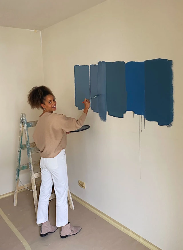 A munka nem áll meg. Mai napomat egy ügyfelemnél kezdtem. Szeretem végigkövetni az összes munkafolyamatot és kivenni belőle a részem. Izgalmas kék színskálából sikerült a bútorok hangulatához a tökéletes árnyalatot kiválasztani. Ilyenkor, amikor távol vagyok a családomtól és kisfiamtól naponta többször is videótelefonálunk.