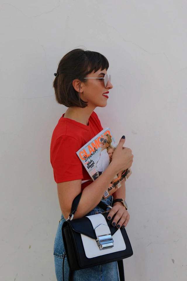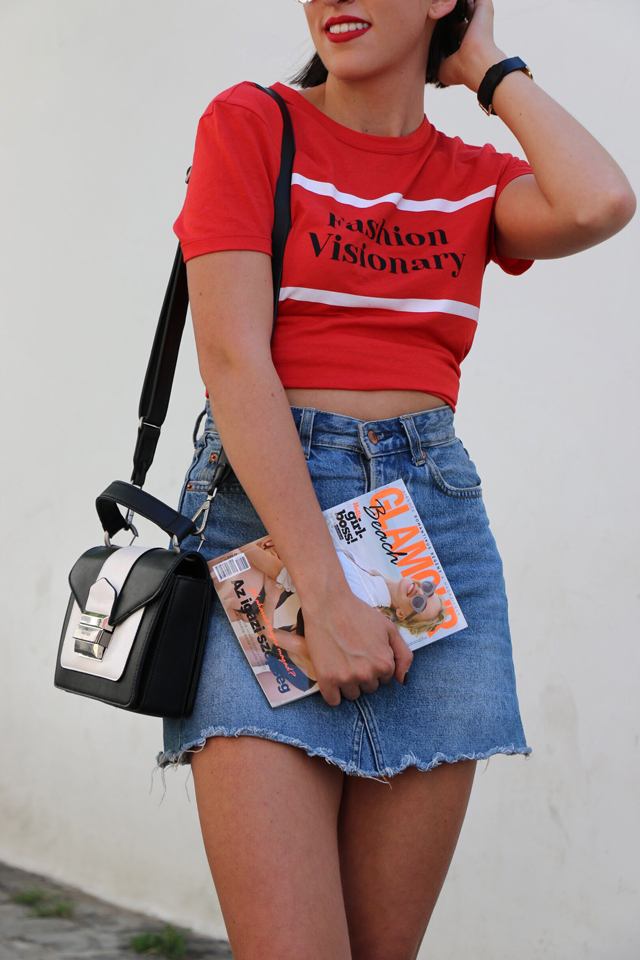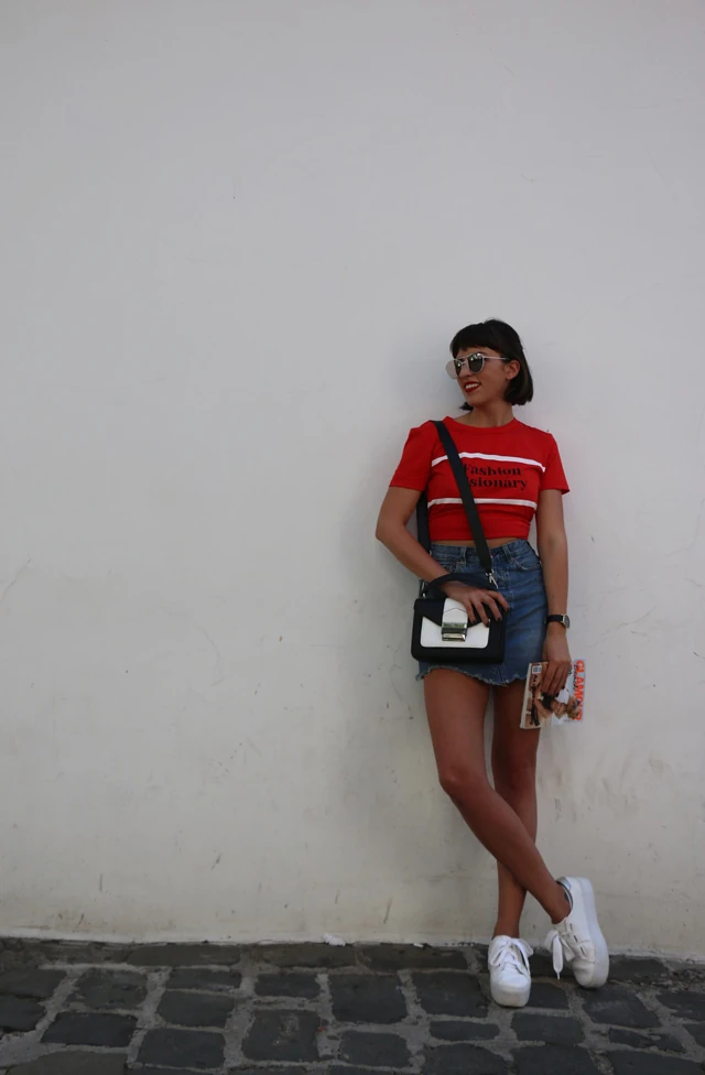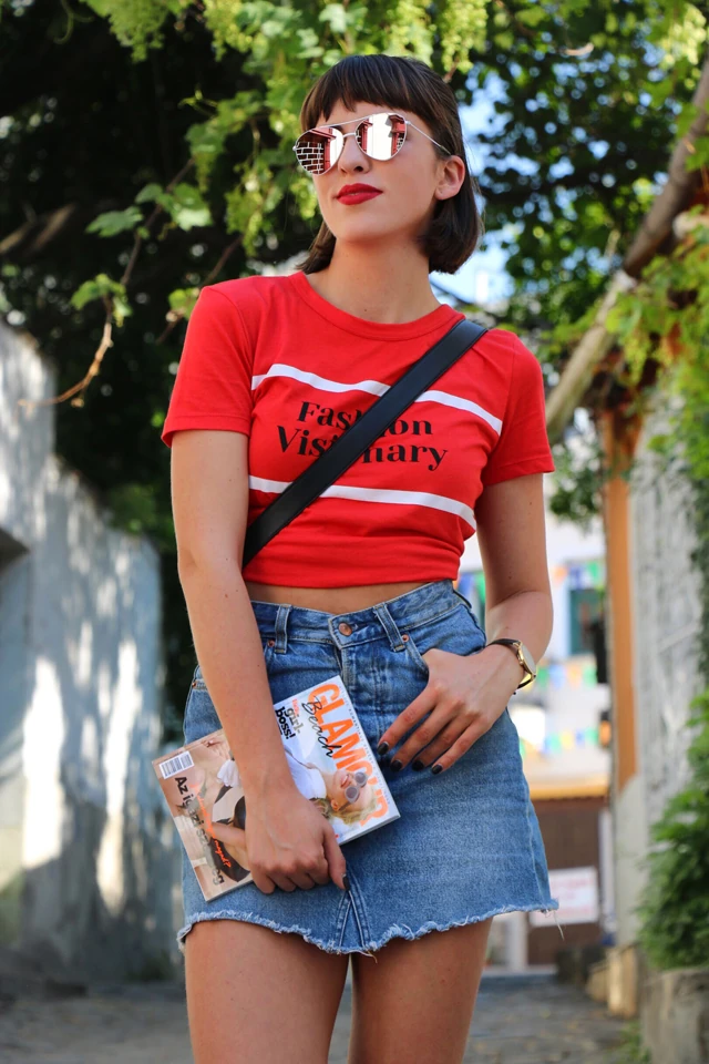 A letisztult stílusomból adódóan nagyon szeretem az alapdarabokat. Ilyen ez a magasderekú farmerszoknya. Egész nyáron megállja a helyét bárhol, bármikor. Nagyon szeretem inggel viselni, amelyet megkötök a derekamon vagy jelen esetben egy egyszerű feliratos pólóval. A kis csavar benne az, hogy a pólót nem bedugva viselem hanem hátul a derekán megkötve egy csomóba, ami ad neki egy plusz lazaságot ugyanakkor átalakul a póló egy crop toppá. Nagyon sokszor alkalmazom ezt a praktikát.