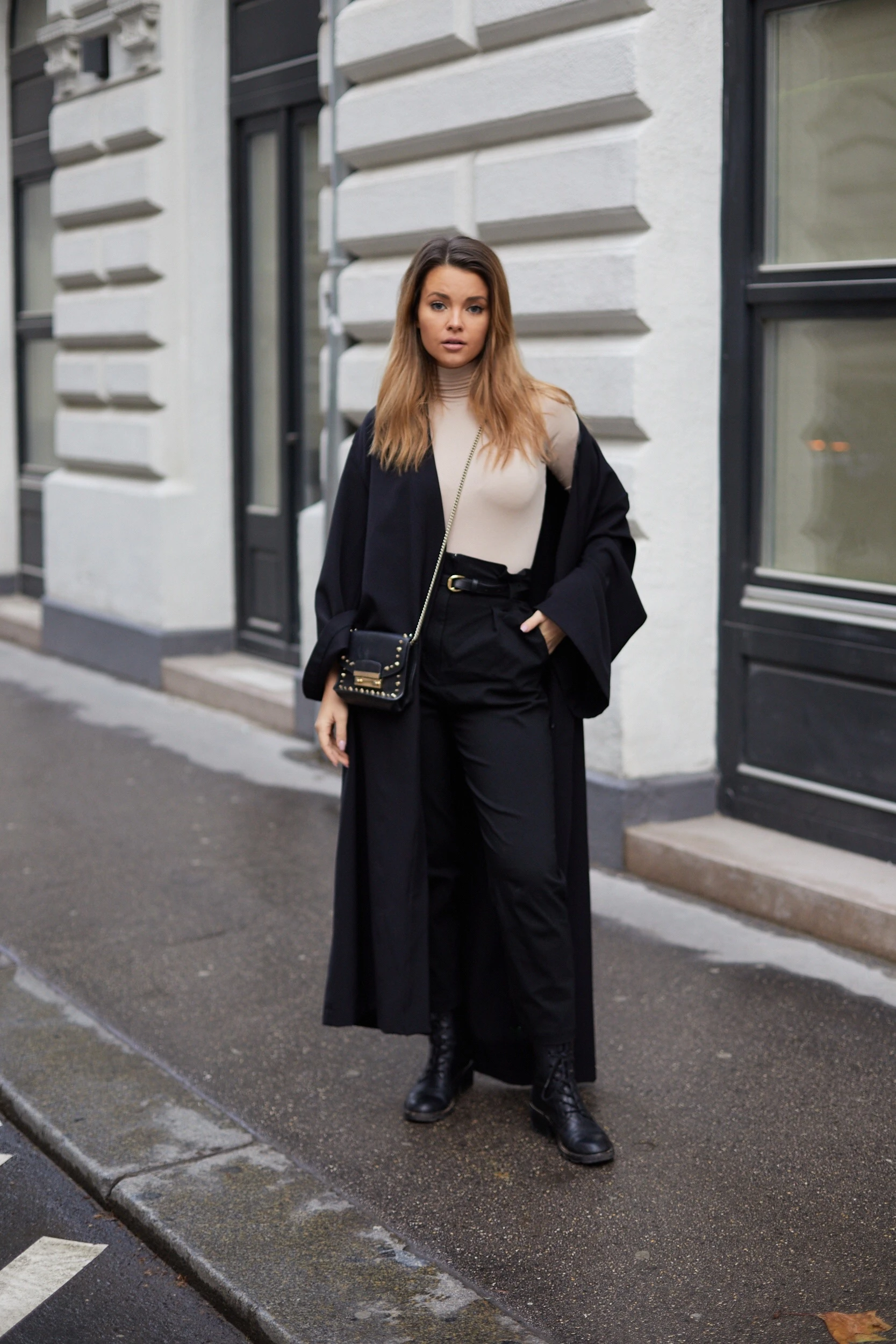 Az utolsó szettem a hétre egy kicsit sötétebb, főként fekete színekkel domináló szett. Az időjáráshoz viszonyítva találtam ki, ami meg is látszik az arcomon. Viccet félretéve, nagyon szeretem azokat a nadrágokat, amiket derékban meg lehet kötni és alul egy kicsit bővebbek, mert nagyon szép alakot csinál, kicsit slankít is, pláne ha fekete. Egy natúr színű kényelmes body-t választottam hozzá és egy utcai kimonót, amit szinte bármire fel tudok venni, mert minden szettet feldob lazaságával és eleganciájával. Ezt a bakancsomat pedig már rongyosra hordtam, annyira szeretem.