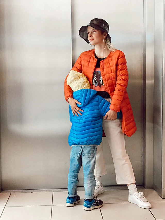 A mai szettemben sok régi kedvencem is van. Vannak olyan ruháim, amiket általános iskolás hetedikes korom óta hordok. A táskám a Recyclefashion Storeból van, Lendvai Lilla csodásat alkotott, amikor létrehozta a ruha körforgását. A nadrágom ezeréves Levi's, még azokból az időkből, amikor nem újra, hanem még menő volt a magasderekú farmer. Az esőkabátomat Lisszabonban vettük pár éve tavasszal, amikor arról volt szó, hogy nyár lesz, de süvített a szél és esett az eső. Egészen elképesztő arcát mutatta elázva Portugália.