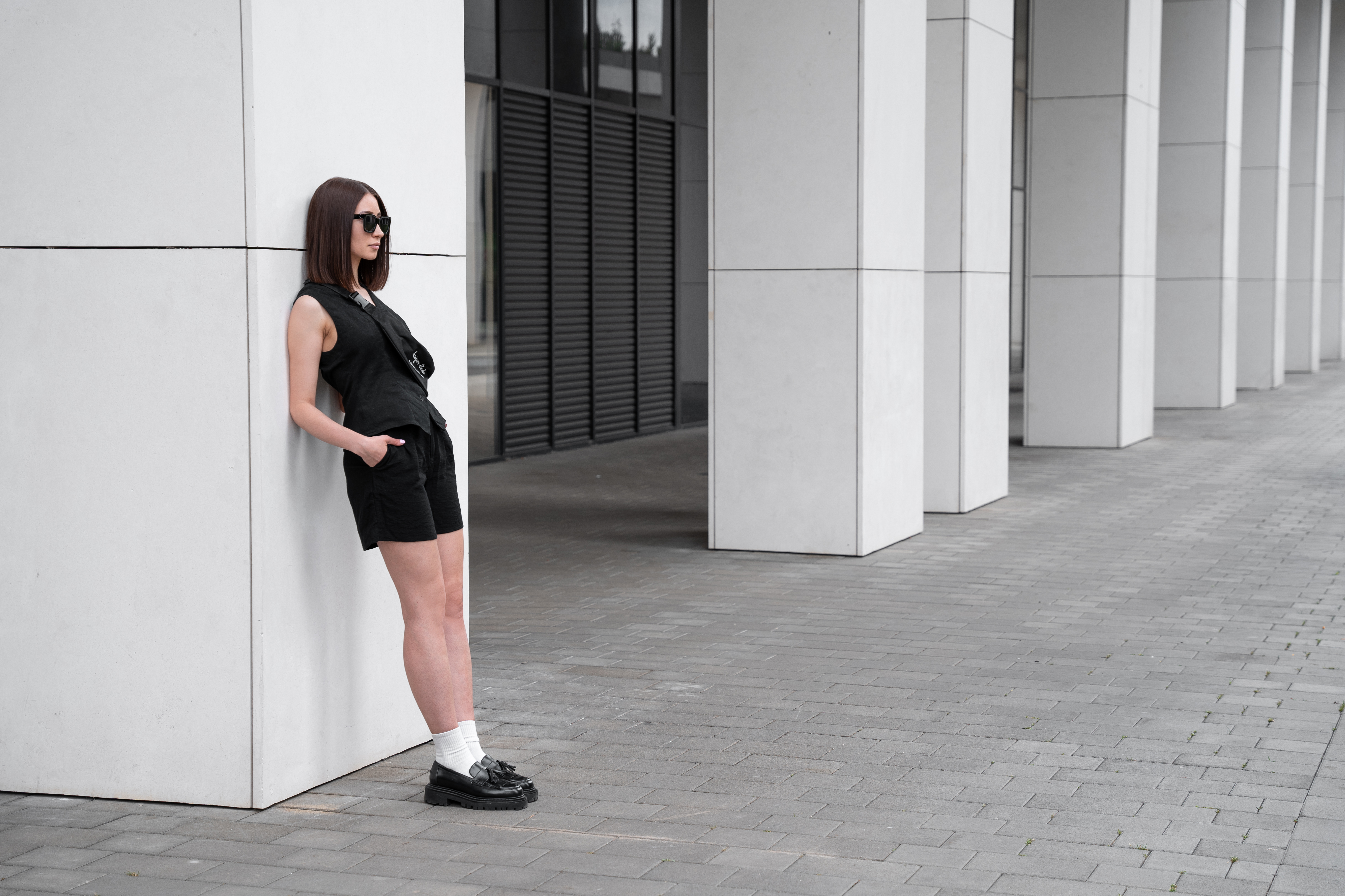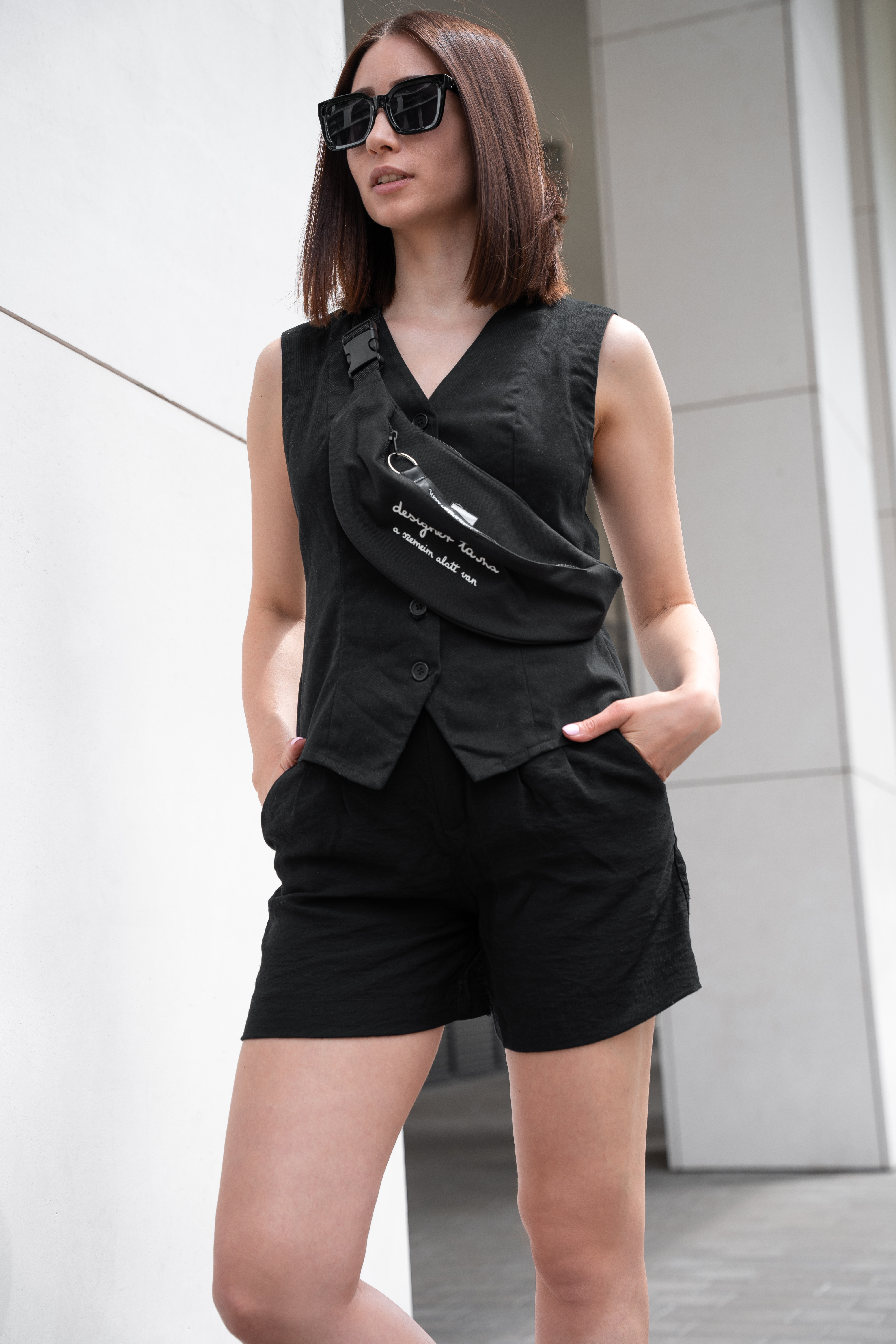 A ruhát tekintve a kényelem volt a fő szempont. Visszanyúltam kicsit a régi énemhez, amikor is kizárólag sötét színekbe burkolóztam, hiszen full fekete a mai szettem. Ez az igazi jolly joker számomra, hiszen a feketével sosem lehet mellé lőni. Bár a melegben ugyan nem túl praktikus választás ez a szín, éppen ezért választottam lenge anyagból készült darabokat. Imádom az elegáns stílust ötvözni a sportossal, szerintem rendkívül modern megjelenést tud kölcsönözni. A rövidnadrág, a zokni és a táska a lazább vonalat, míg a cipő és a mellény a maszkulin stílust erősíti. A mellény idén nagyon divatos darab, így az én márkámból és természetesen a ruhatáramból sem hiányozhatott. Ez is egy olyan darab, amit változatosan, több stílusban is lehet viselni, nem beszélve a fekete rövidnadrágról, ami alapdarabnak számít.
