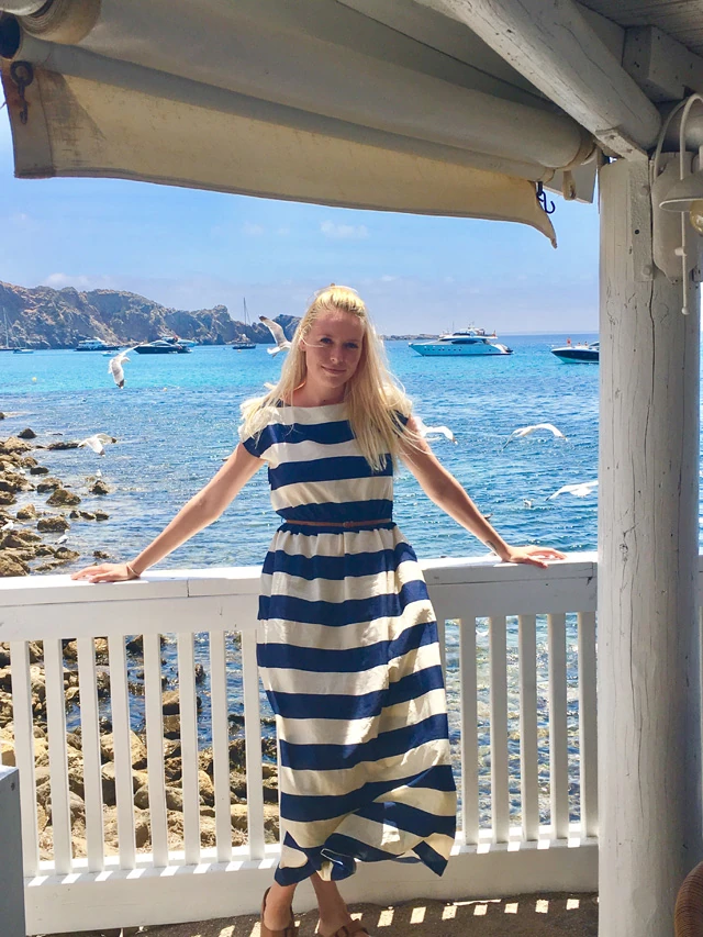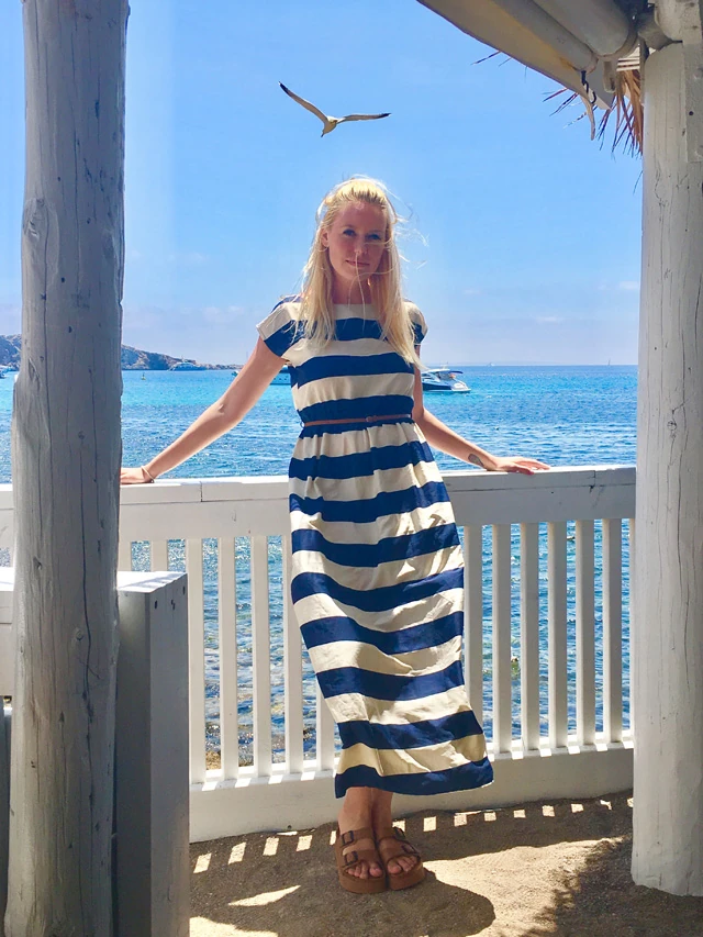 Ebéd Xarcuban. Ez egy csodálotos kis eldugott hely, ami közkedvelt a gazdagok körében a lokáció és intim hangulat miatt. Ibiza egyébként az a hely, ahol nem megy a rongyrázás. Mindenki lazít és hippi módba kapcsol. Luxusmárka üzletek sincsenek, leszámitva egy-két boltot. Nagyon vicces, mert igazán jómódú barátokkal ebédeltünk, de senkin nem volt Gucci öv vagy Hermes táska. Sőt. Azon versenyeztünk, hogy ki visel olcsóbb outfittet, és kiderült, hogy öt-tíz dolláros szettekben nyomultunk mindannyian. Úgy hangzik, talán magam ellen beszélek, de a viselet csak egy eszköz, ami jó, ha tükrözi a személyiséget, de baj, ha az határozza meg.