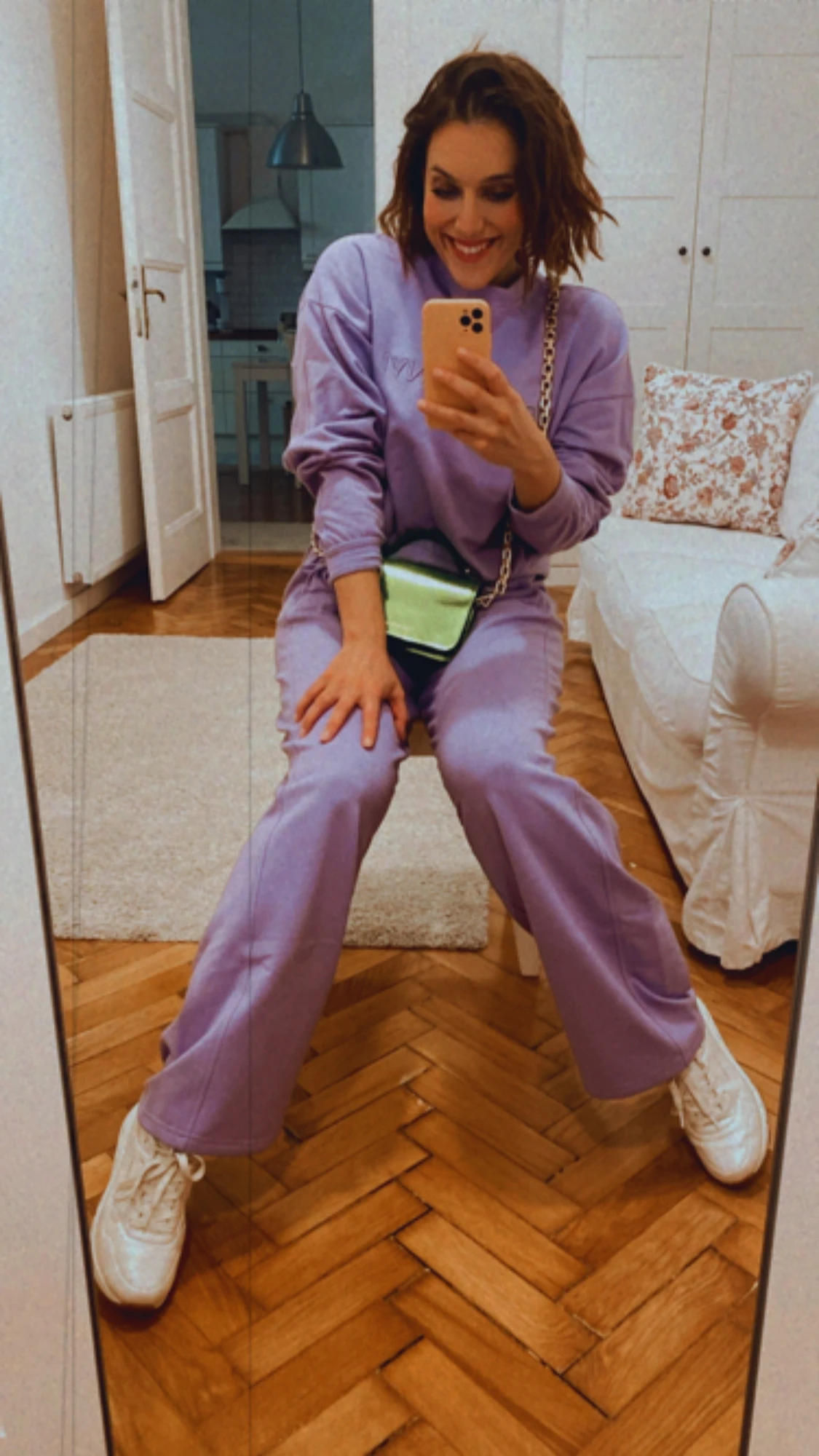 Ma a barátaimmal kertipartiba megyünk. Berobbant a nyár, napközben forróság van, de estére jól jön még a hosszú szett. Kerényi Virág vagány lila melegítőjét választottam mára, két napja ugyanezt a fazont viseltem feketében, köszi Virág miattad boldogan viselek színeket!