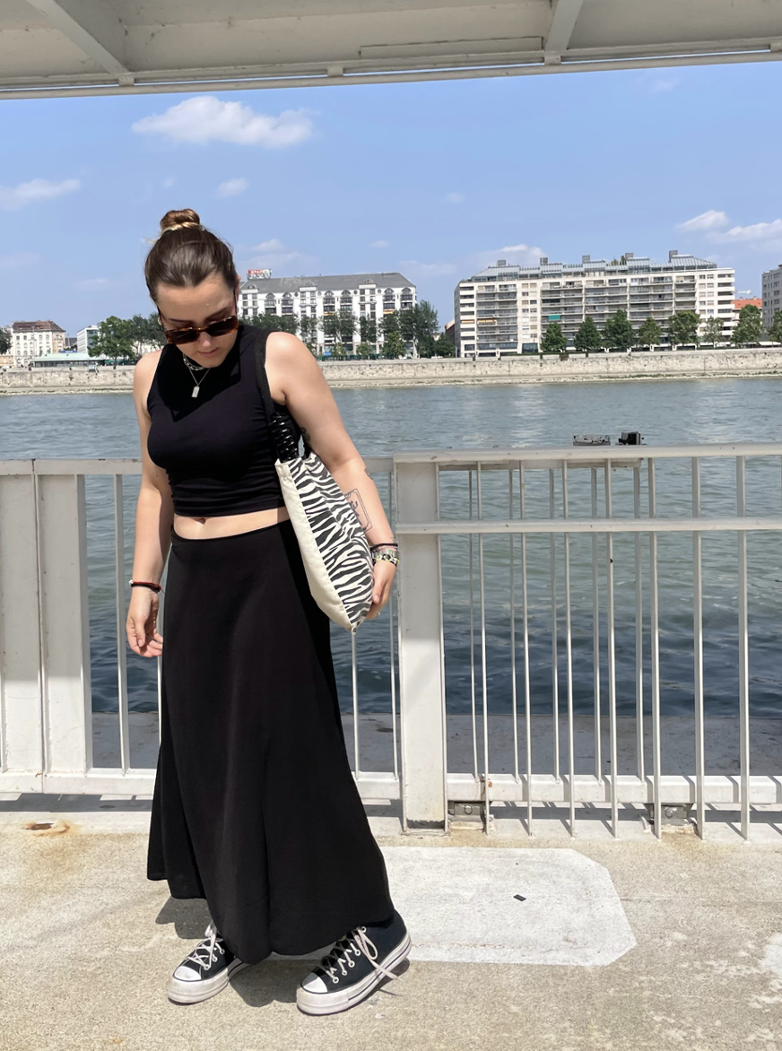 Ezen a hétfőn Dorcival egy Petőfi Rádiós beszélgetésre voltunk hivatalosak - mivel negyven fok volt, de fújt a szél, kicsit hisztiztem, hogy mégis mit vegyek, fel. Egy egyszerű fekete garbó, egy hosszú szoknya, és a mindig megbízható Conversem mellett döntöttem, egy kicsit extrább állatmintás vászon táskával, ami vizsgaidőszakban a tételeimtől kezdve, félig megevett müzliszeleten át mindent is tartalmaz, amire szükségem lehet.