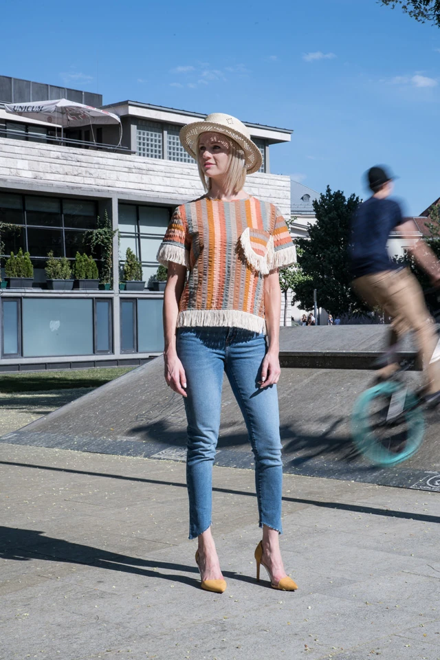 Ma az Erzsébet téri Skate Parkban fotózunk néhány izgalmas képet, közös projektünk, a @friendsinhungary Instagram oldalára. Utolsó összeállításom, egy kényelmes bokáig érő farmer, citrom színű magassarkú, ANNA DAUBNER INCA toppja és VECSEI MILLINERY szalmakalap.