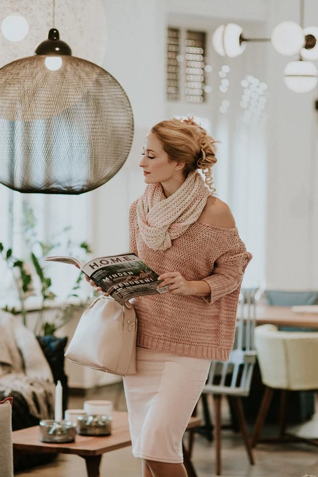 Éppen egy lakásfelújítás közepén járok és persze rengeteg a tennivaló, de nagyon szerettem volna végigpásztázni pár lakberendezési üzletet inspirálódás végett. A tervezőm egy szuper helyet ajánlott, ahol az izgalmas bútorok mellett extrém lámpákkal is barátkozhattam. Púder hangulatban ébredtem és egy elég romantikus outfitben indultam útnak (szerintem titkon a tervekhez öltöztem). Nagyon szeretem ezt a 100% pamut pulcsimat, laza és kényelmes. Farmerrel is sokat hordom.