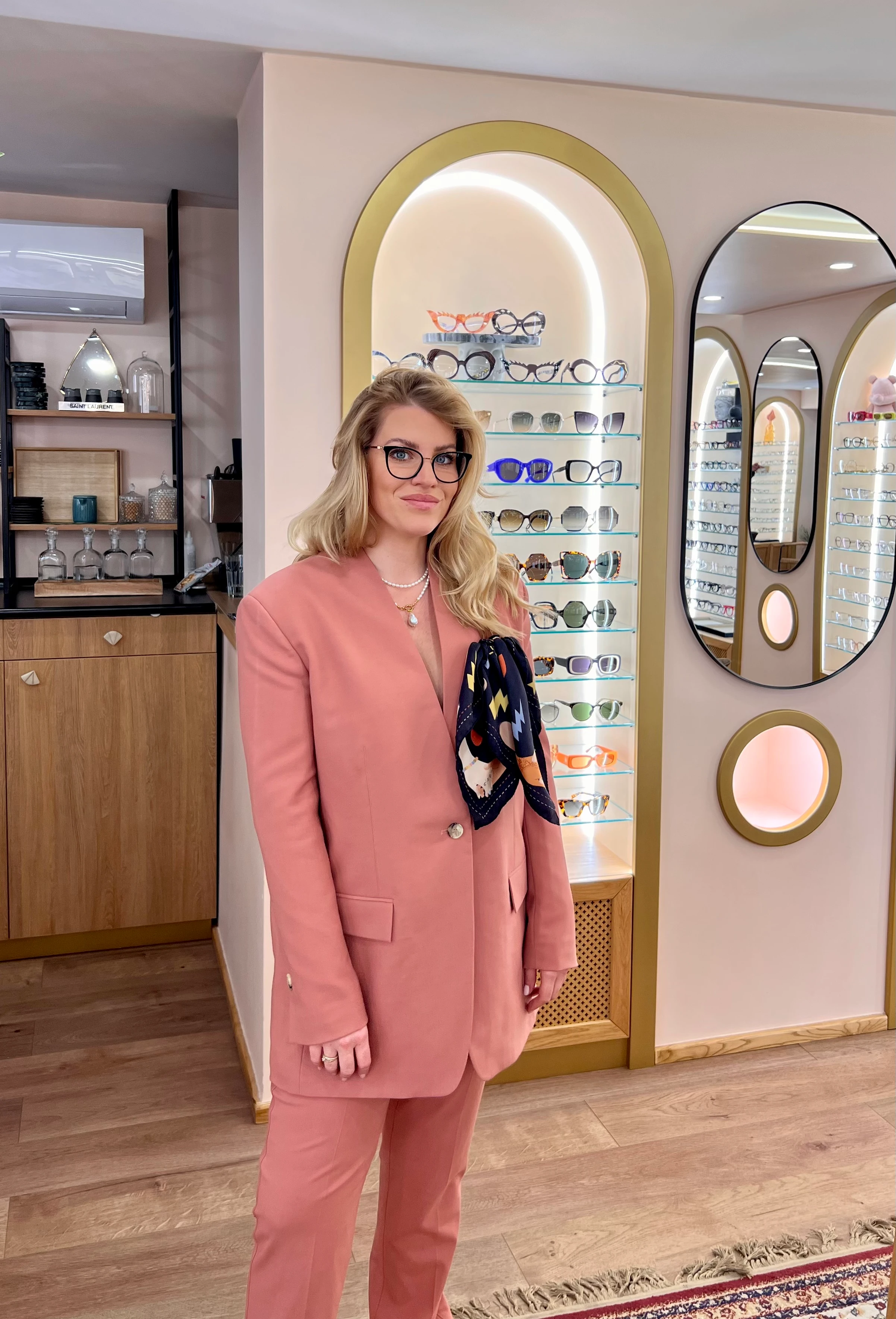 „A szerdai napomat mindig Budapesten töltöm. Az üzletben általában blézerben, zakóban vagyok. Különösen szeretem azonos színű nadrággal kombinálni a szettem. A púderes rózsaszín pedig mostanában kedves szín számomra. Egy kendővel dobtam fel ma, ami egy kollaboráció által született Daubner Anna és a gyermekhíd alapítvány jóvoltából. Szeretem a jótékonyság ezen fajtáját is. Az ékszereim pedig egy kedves barátnőm kezei munkája amit mindig megcsodálnak, és számomra külön öröm, hogy van kedvenc magyar ékszerkészítőm. A szemüvegem egy fenntartható márka, újrahasznosított anyagokból és titániumból."