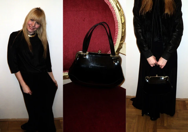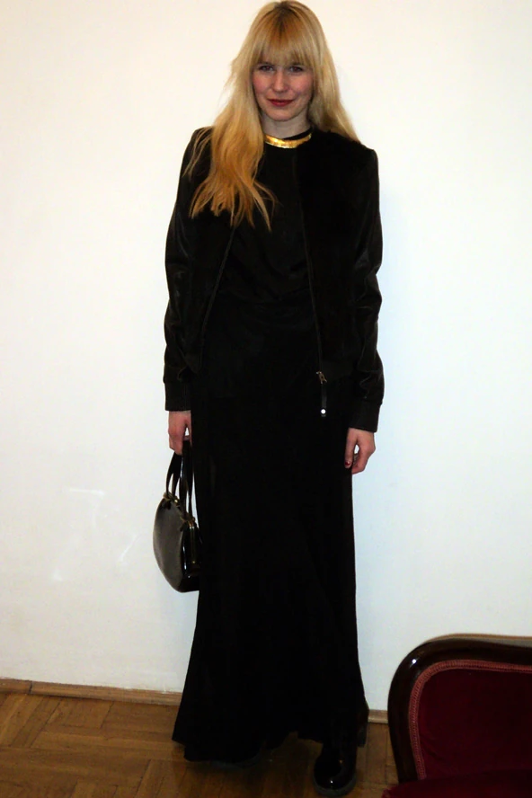 Egy fekete bőr és nyúlszőr dzsekit, magas sarkú lakk Martenst, és egy széles, arany színű nyakláncot vettem fel. A nyakláncom és a táskám családi örökség, a lakk kézitáskát a barátom nagymamájától örököltem.