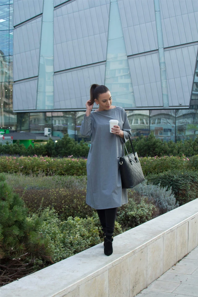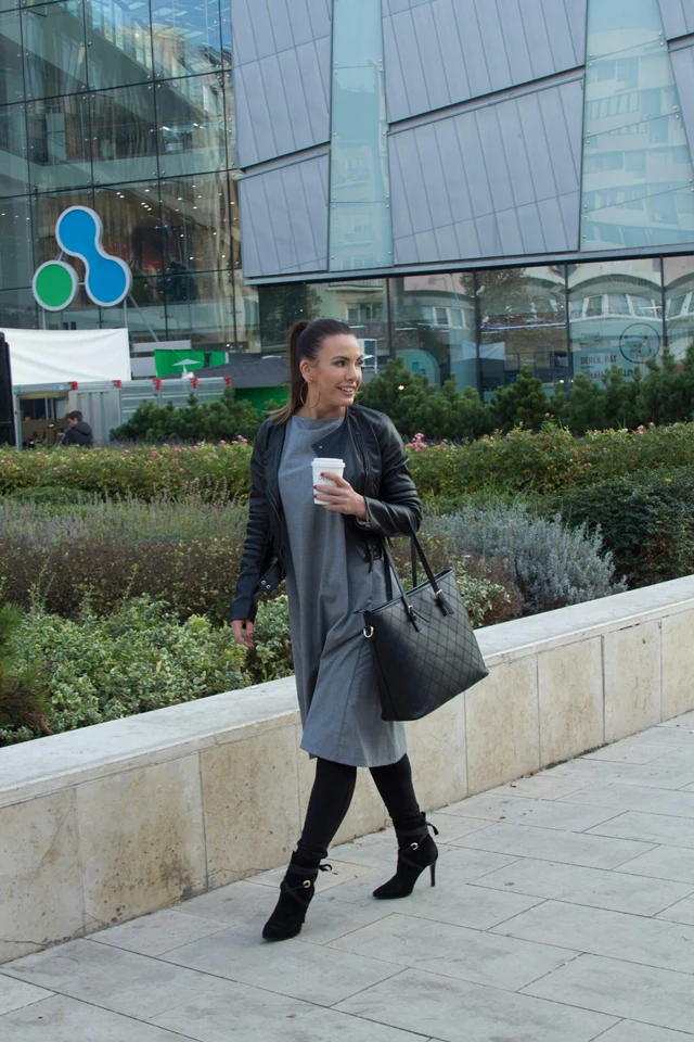 Ez a szürke ruha mindenhez passzol. Ma van pár szabad órám, hogy szétnézzek néhány üzletben a karácsonyi dömping előtt. Mivel most szerencsére nem rohanok, így egy elegáns magas sarkú csizmát választottam hozzá, a pörgős napokon azonban lapos talpúval szoktam hordani.