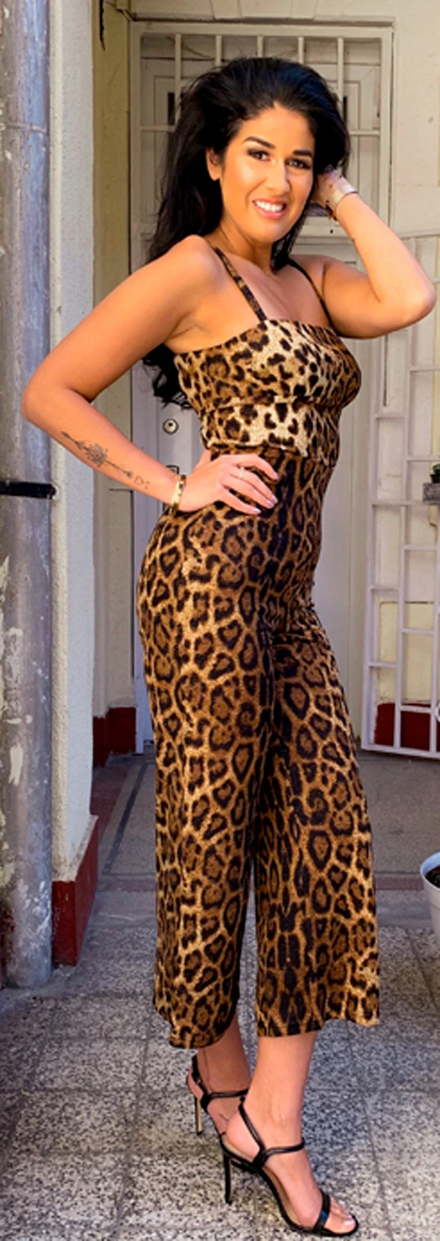 Szerencsés vagyok, mivel az éneklés mellett folyamatosak a médiaszerepléseim is, itt is éppen egy forgatásra igyekszem. Nagyon szeretem az aranyba hajló, barnás árnyalatú darabokat, a párducminta az egyik kedvencem. Jól megy a karakteremhez.