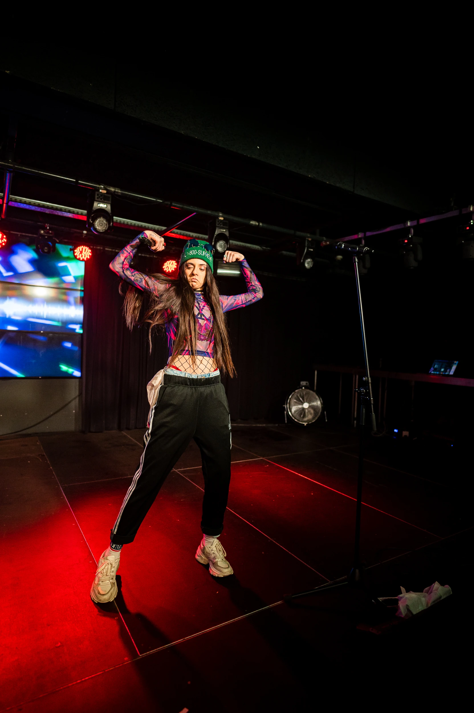 Több réteg is volt rajtam aznap: két nadrág, több felső, hogy fellépés közben könnyen át tudjam transzformálni magam, de volt rajtam minden más is: neccharisnya, átlátszó croptop, és többféle kiegészítő.