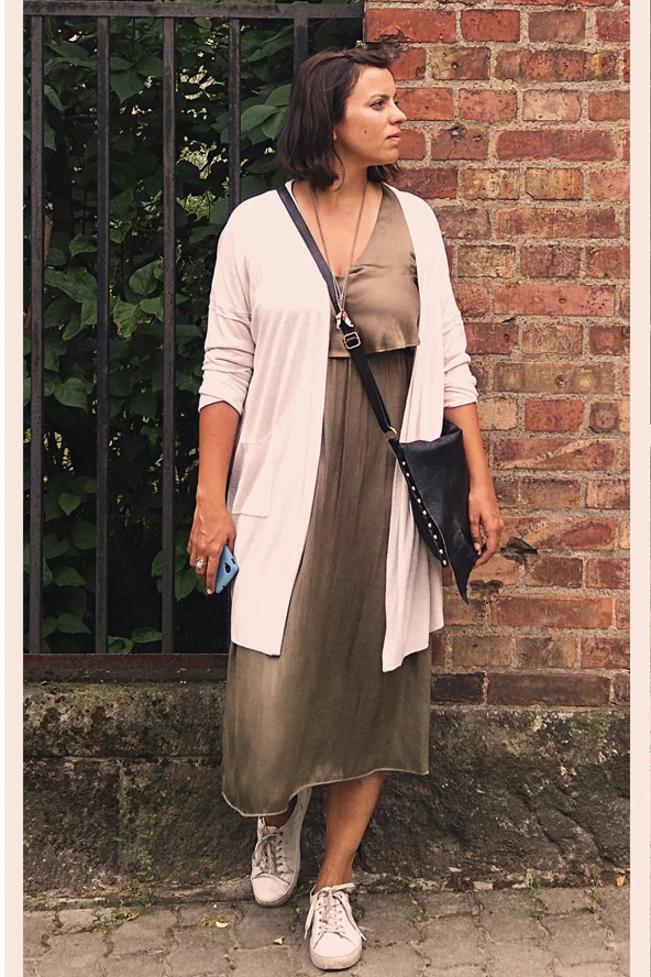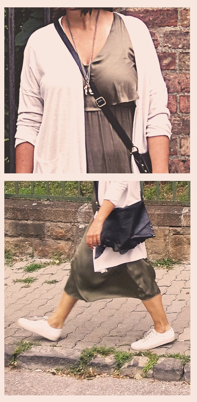Ezt az olívazöld ruhát azért imádom, mert egyszerre elegáns és sportos, attól függ, mivel kombinálom. A nagy melegben könnyedén lengedezik, nagyon kényelmes. Az egyik kedvenc kiegészítőm ez a bizarr nyaklánc: két lábfej csüngedezik rajta.