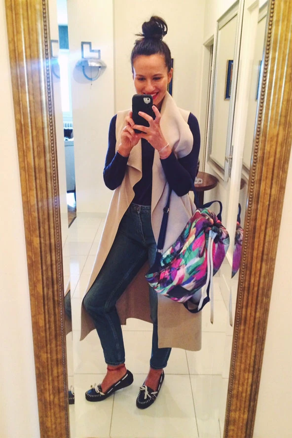 A szerda az új hétfő, a rohangálós napom. Indulok a varrodába, hogy elhozzam az új táskákat, majd jöhetnek a textil nagykerek és a designer üzletek. Ilyenkor sokat ülök kocsiban, szóval nem veszek fel kabátot, maximum ezt az ujjatlan "leplet", amit a Lakásvásáron szereztem be (ahogy kb. minden második ruhadarabomat. Igazi kincsekre lehet itt szert tenni). És a kedvenc táskám, a legtöbbször ez van nálam, szinte mindenhez illik.