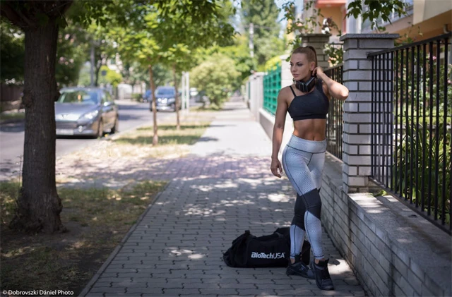 Éppen a csoportos edzésemre igyekszem, útközben meghallgatom az aktuális mixemet, és fejben összerakom az óra menetét. Mivel havonta több száz nőnek tartok edzést, hétvégente pedig járom az országot, így a minőség és a kényelem mellett az is nagyon fontos szempont, hogy néz ki a ruha, amit éppen viselek. Leggingseknél magas derék párti vagyok, szerintem sokkal kerekebb feneket varázsol, mint egy csípő fazon. Mellé egy félvállas egyszínű rövid topot választottam.