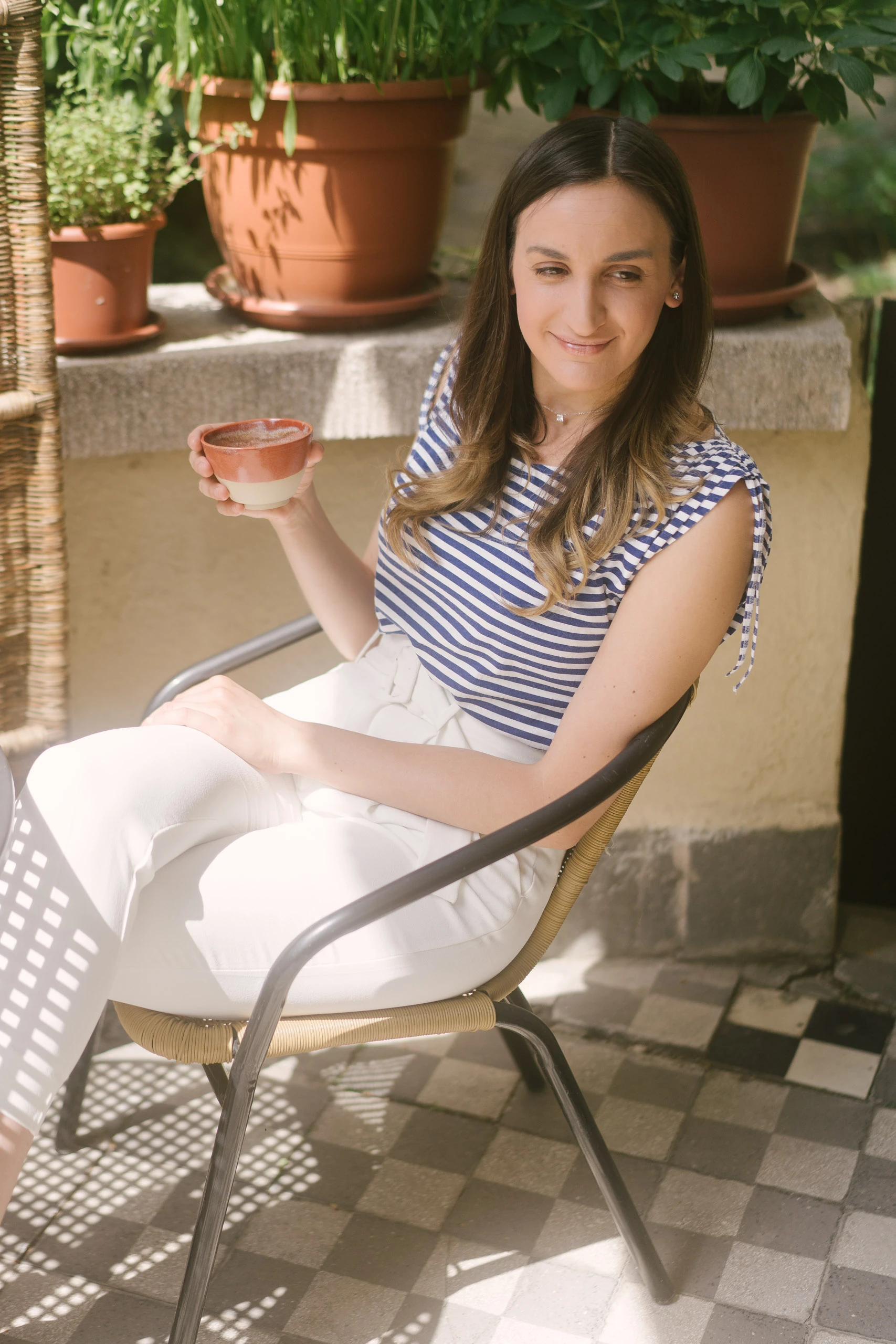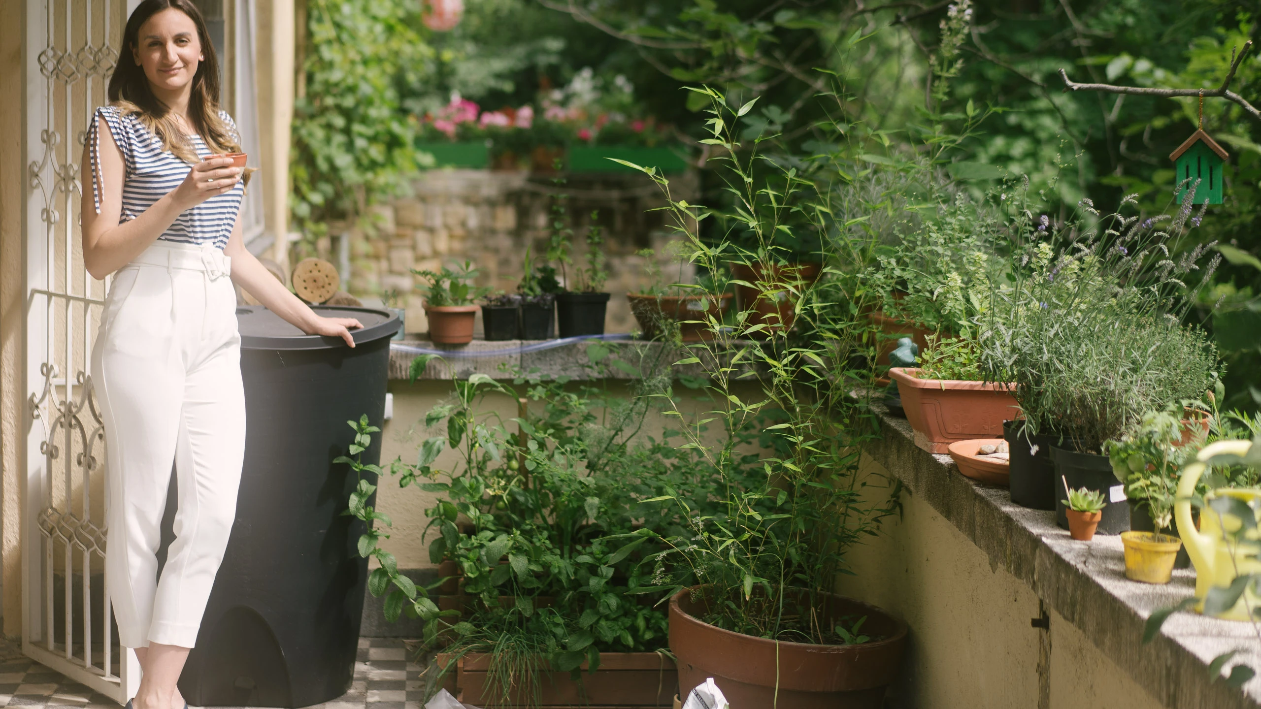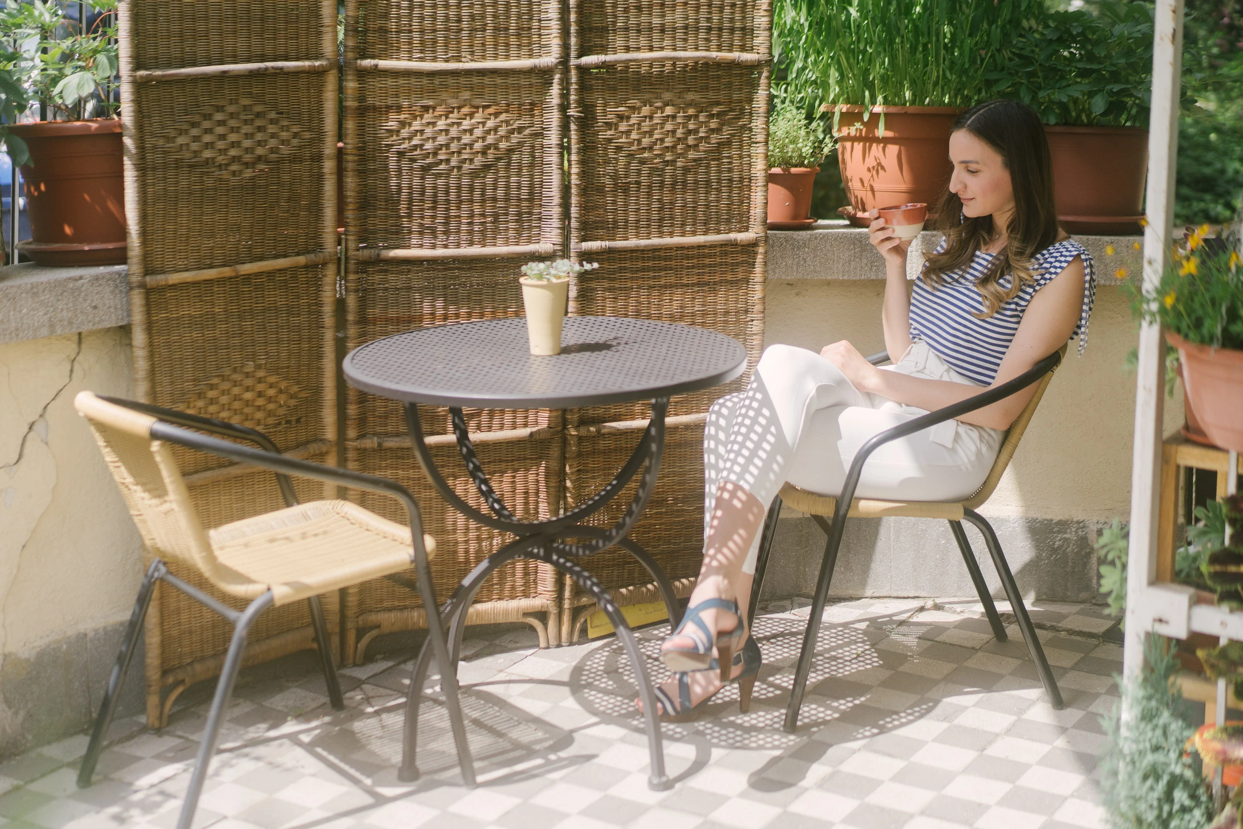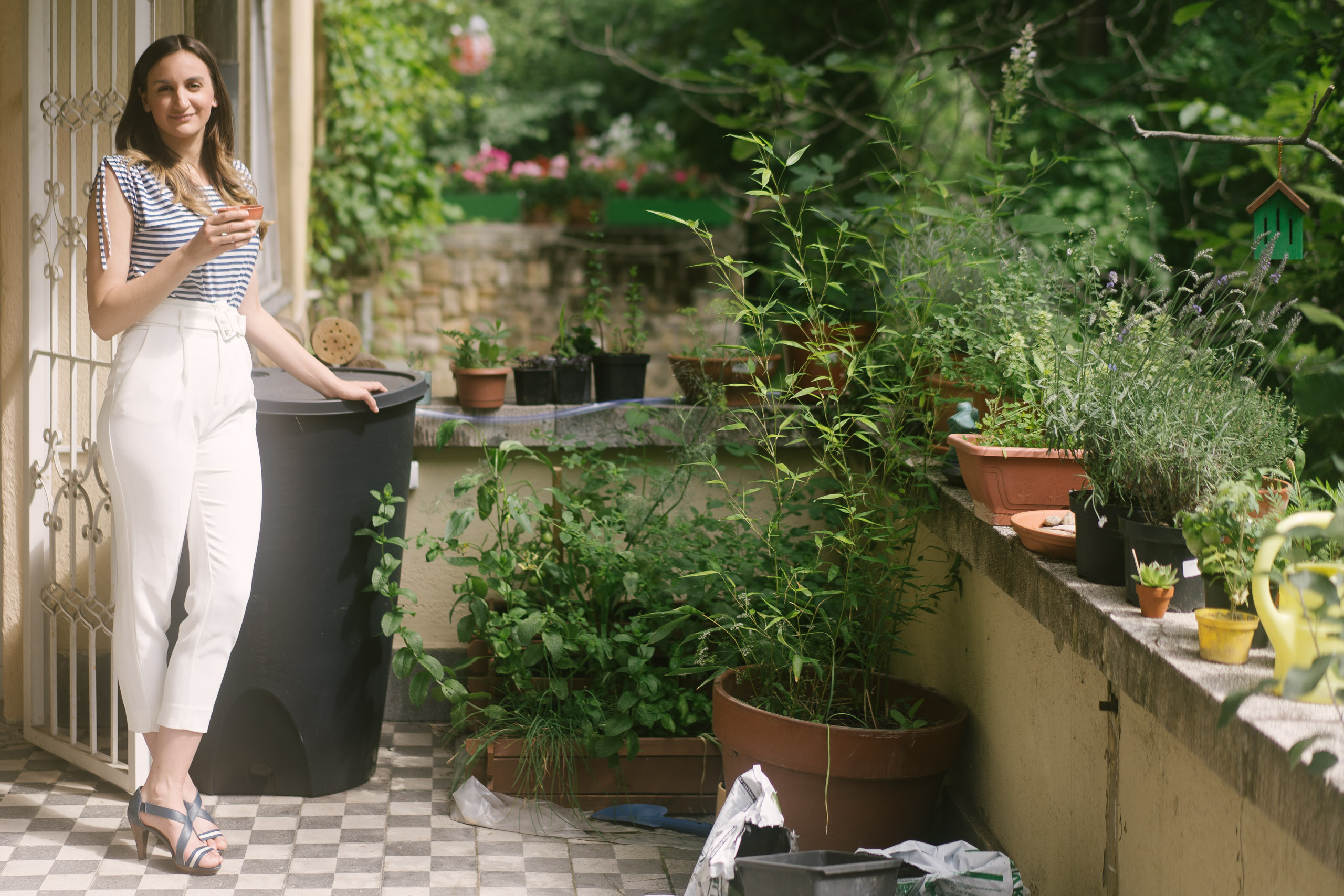 Nagyon szeretem ezt az elegáns letisztult navy stílust, így ma ezt a szettet választottam. A tegnapi koncert és a szervezés fáradalmai után ma egy kicsit pihenősebb napot tartok, szóval ki is ültem a teraszunkra egy jó kávéra. Itt nevelgetjük a kis növényeinket, a magaságyásunkat, komposztálunk, vannak rovarhoteleink, és az új szerzemény, a nem túl szép, de annál hasznosabb esővízgyűjtő, igyekszünk csak ezzel locsolni. Számomra ez az első lépés egy környezettudatosabb élet felé, de még mindig nagyon sok dologban kell változtatnom.