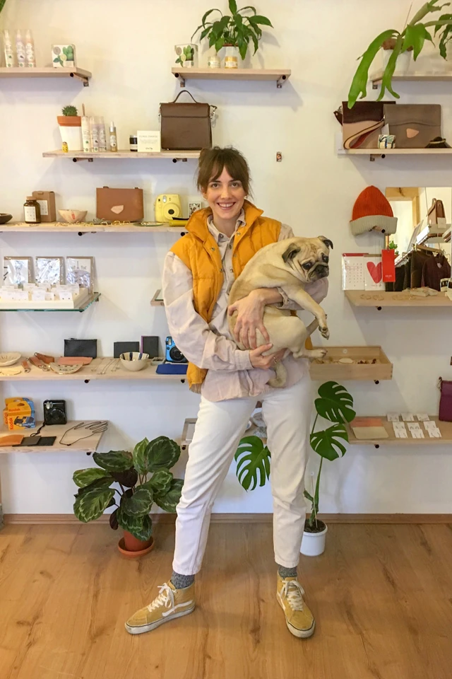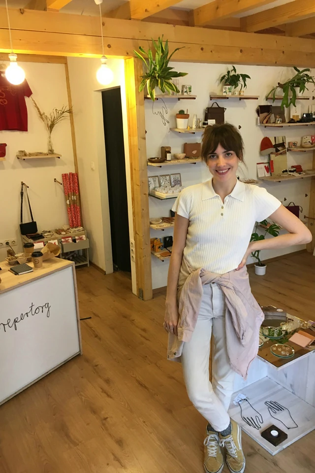 Ma egész nap az üzletben vagyok, ugyanis heti egy alkalommal én szolgálom ki a vásárlókat. Fontos és érdekes tapasztalat ez, hiszen így első kézből kapok visszajelzéseket a ruhákról és a többi termékről is. A Repertoryt a The Mama Kin ékszermárkával együtt alapítottuk és a saját dolgaink mellé megkerestünk olyan márkákat, akikkel kiegészülve teljes a kínálat. Így a ruhák és ékszerek mellett bőrkiegészítőket, füzeteket, gyertyákat, kerámiákat is találtok nálunk. Fontos része a koncepciónknak a növények szeretete, tavasztól-nyárig igyekszünk a legizgibb és "könnyen életbentarthatókat" beszerezni, amiket szintén meg lehet vásárolni. Ma velem jött Malacka, a mopszom is.