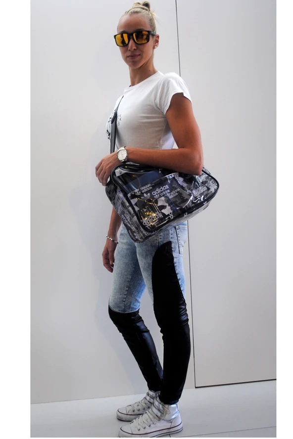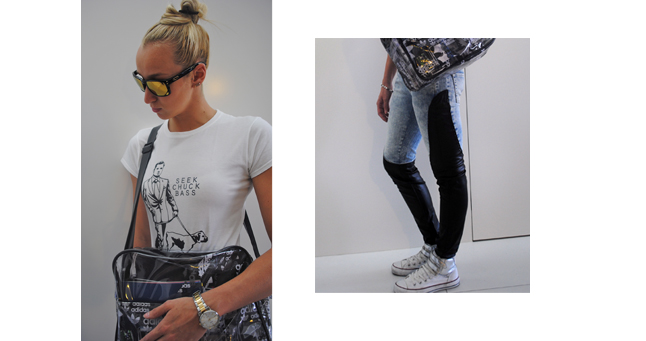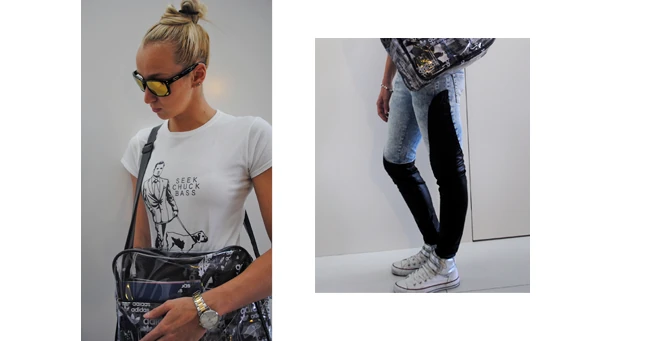 A mai rohangálós, ügyintézős napomhoz sportosan öltöztem, de szeretem, ha van az öltözékemben egy kis plusz. A bőrbetétes nadrágom, és az ezüst tépőzáras Conversem megadja azt a pluszt, amit szeretek :) nem beszélve az átlátszó plasztik táskámról!