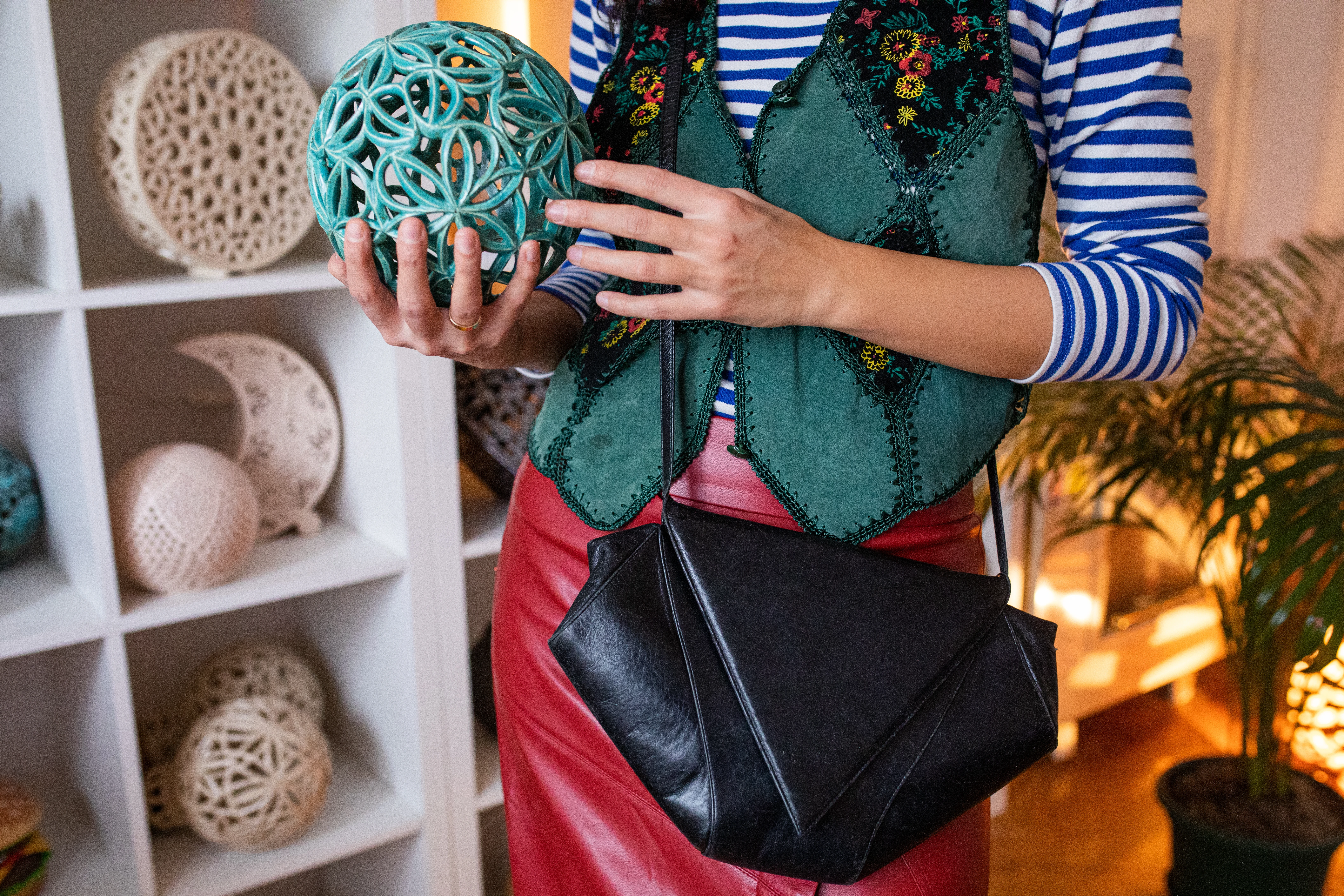 A sapkám anyumtól, a csíkos felső a bátyámtól, a mellény a Vintedről, a szoknya a barátnőmtől, a táskám pedig a Humanából van.