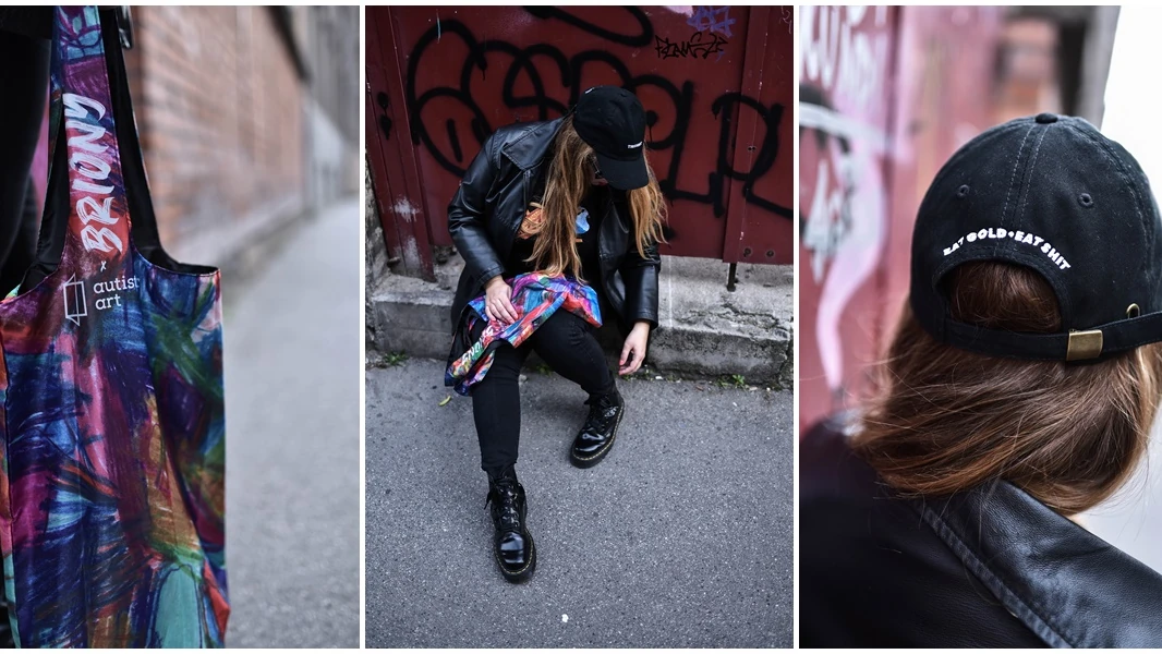 Szívesen vásárolok támogatói termékeket és hordok olyan kiegészítőket, amiken jól látható feliratok, szimbólumok vannak. Ez a look egyrészt a múltam egy-egy szeletét tükrözi, hiszen a nyers, felszabadult és (ön)ironikus grafikáiról ismert Thisshit Skatework sapiját viselem (a márka tervezője régi barátom a szülővárosomból), az anyukámtól örökölt dzsekit pedig kedvenc Martens bakancsommal párosítottam. Másrészt az Autistic Art táska és póló a jelenemet, az „ügyeim” egyikét, az alapítványok és civil szervezetek helyzete iránti érzékenységemet szimbolizálja. (Az Autistic Art termékek megvásárlásával a miskolci Autista Alapítványt támogathatjátok).