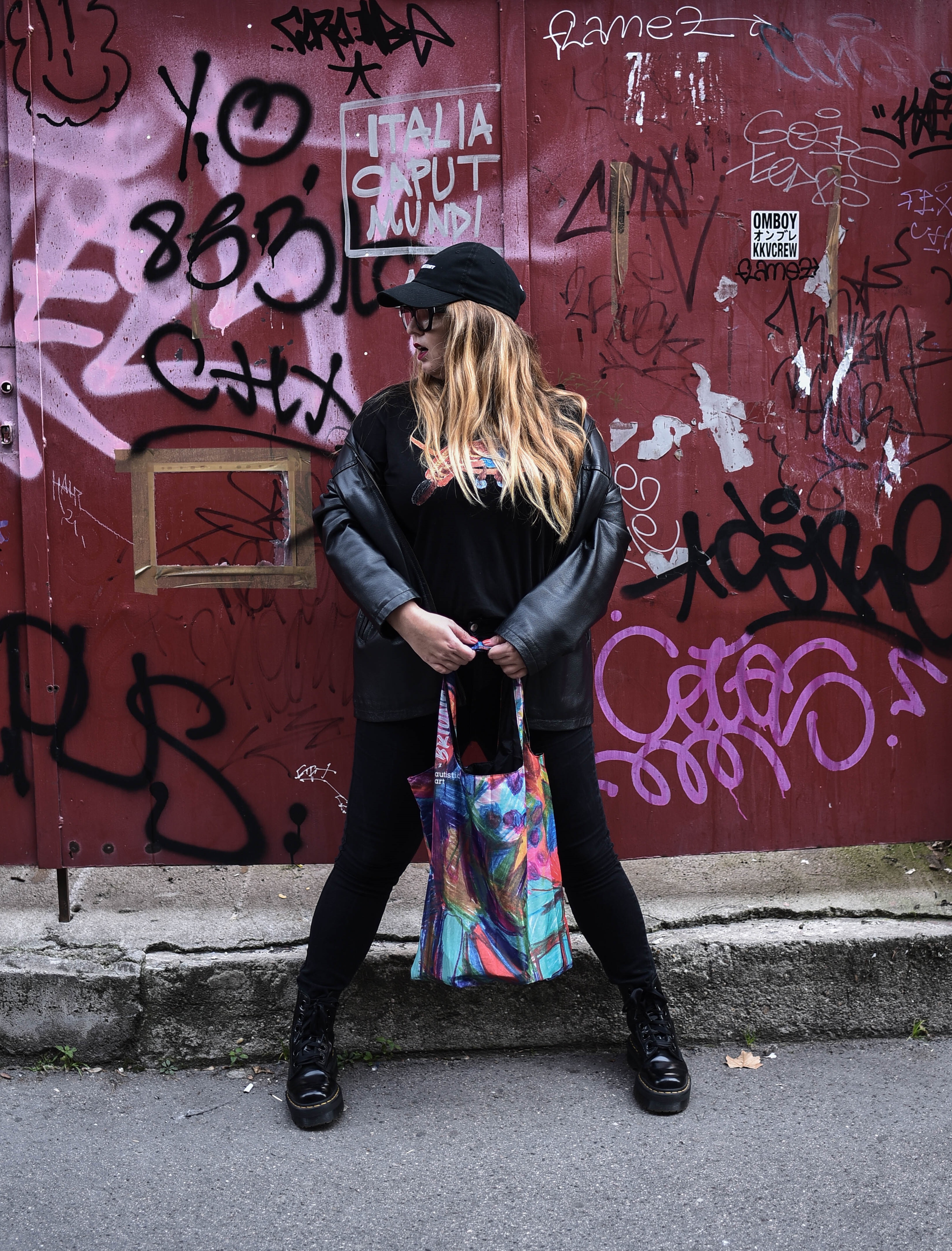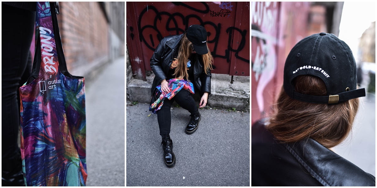 Szívesen vásárolok támogatói termékeket és hordok olyan kiegészítőket, amiken jól látható feliratok, szimbólumok vannak. Ez a look egyrészt a múltam egy-egy szeletét tükrözi, hiszen a nyers, felszabadult és (ön)ironikus grafikáiról ismert Thisshit Skatework sapiját viselem (a márka tervezője régi barátom a szülővárosomból), az anyukámtól örökölt dzsekit pedig kedvenc Martens bakancsommal párosítottam. Másrészt az Autistic Art táska és póló a jelenemet, az „ügyeim” egyikét, az alapítványok és civil szervezetek helyzete iránti érzékenységemet szimbolizálja. (Az Autistic Art termékek megvásárlásával a miskolci Autista Alapítványt támogathatjátok).