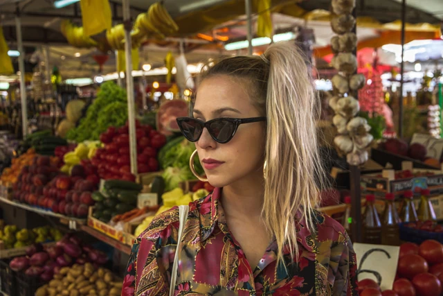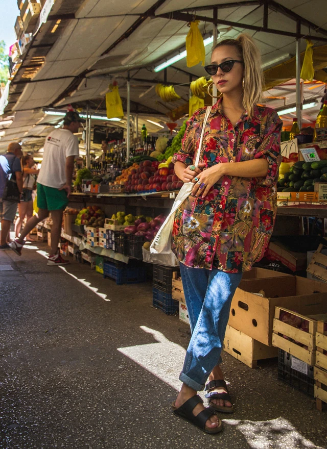 Nyáron teljesen rákattanok a gyümölcsökre, egész nap visszük magunkkal a hűtőtáskában a barackokat, felszeletelt dinnyét stb., úgyhogy egy kis utánpótlásért ellátogattunk a helyi piacra. Vásárláskor a legnagyobb hangsúlyt a kényelemre fektetem, órákig el tudok lenni egy ilyen helyen, és nem szeretem, ha bármi eltereli a figyelmem, mondjuk, hogy túl rövid a szoknyám, vagy a fehér felsőmet összekoszolom gyümölcs kóstoláskor, stb.