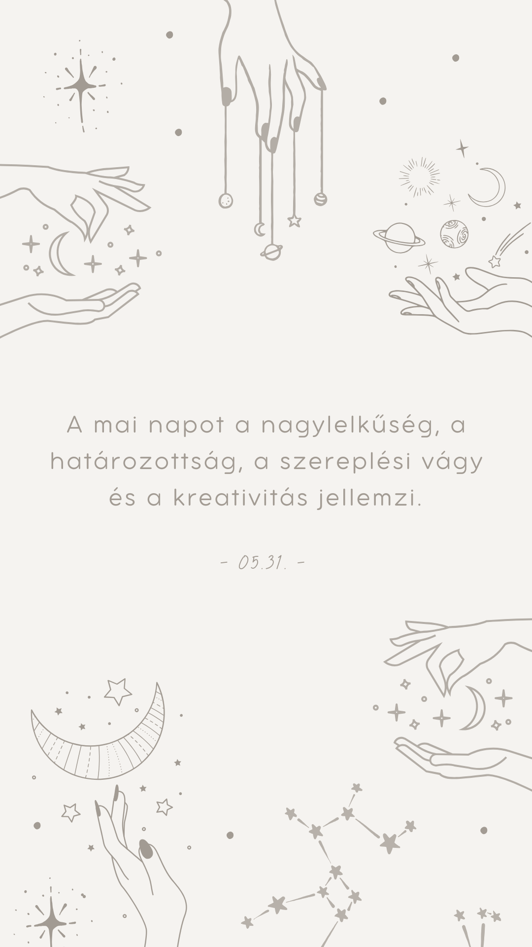 A május növő Oroszlán-Holddal búcsúzik: a mai napot a nagylelkűség, a határozottság, a szereplési vágy és a kreativitás jellemzi. A hajnali időszakban a Hold a Kos- Neptunusszal barátságos fényszöget zár be, ugyanakkor szembenállásba kerül a Vízöntő-Plútóval: lehetnek jósálmaid. Ne rendezz féltékenységi jelenetet, ne akard a párodat birtokolni.