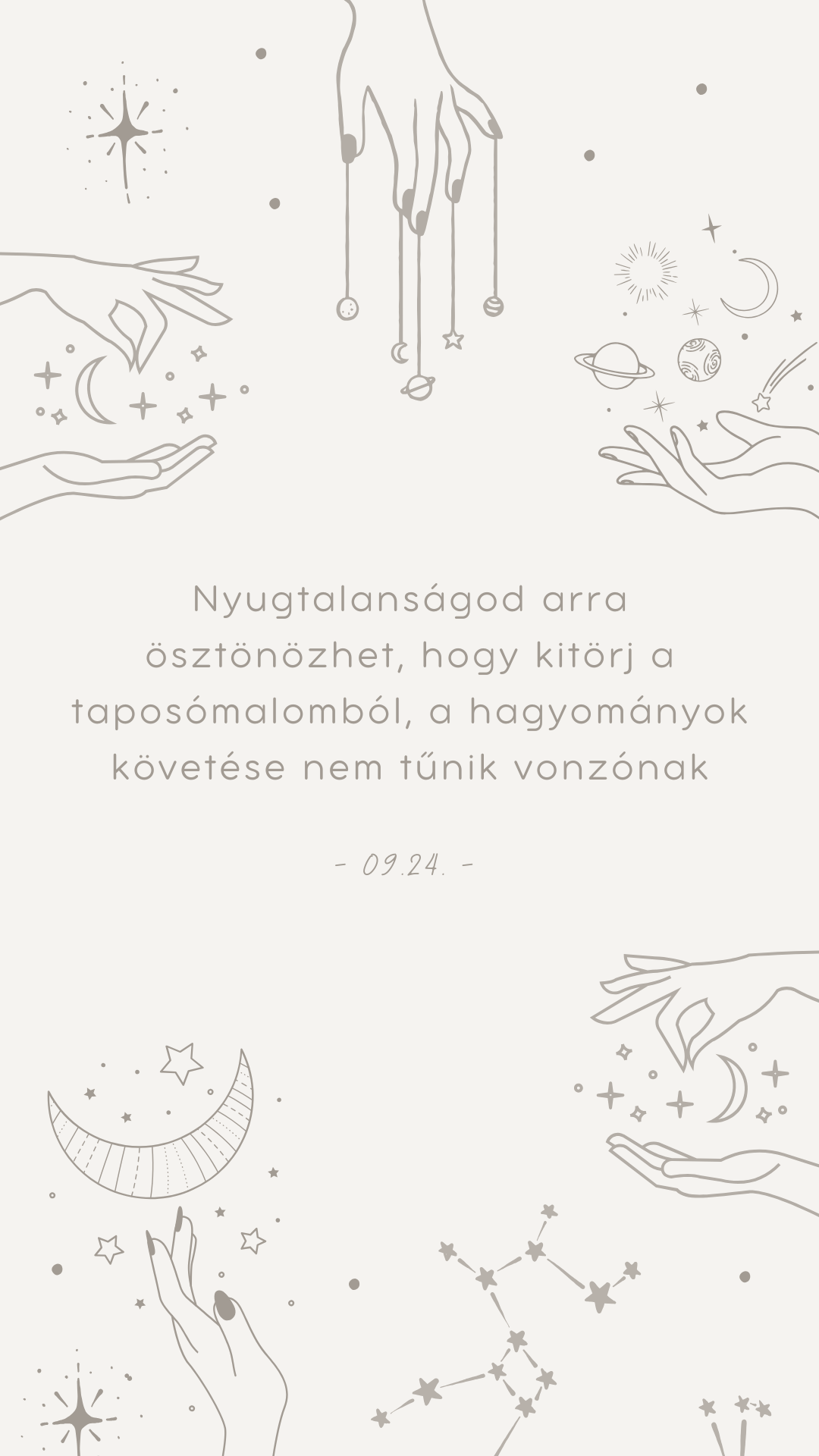 A Mérleg-Nap trigon fényszöge az Ikrek-Uránusszal és a Vízöntő-Plútóval, valamint a Skorpió-Mars quadrátja a Plútóval változásokat és átalakulásokat jelez. Minden, amit teszel, leírsz vagy kimondasz, kihangsúlyozza egyediséged jellemzőit! A média, az új kommunikációs eszközök és a szövetségek nagy szerepet játszanak sikereidben. Nyugtalanságod arra ösztönözhet, hogy kitörj a taposómalomból, a hagyományok követése nem tűnik vonzónak. A napi horoszkóp szerint villanásszerű felismerésekben, meglátásokban lehet részed a jövő irányába mutató célok és tervek terén.