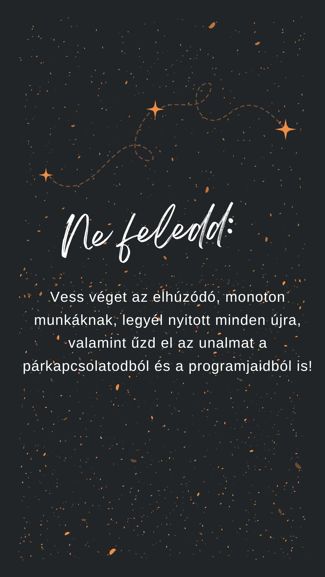 Vess véget az elhúzódó, monoton munkáknak, legyél nyitott minden újra, valamint űzd el az unalmat a párkapcsolatodból és a programjaidból is. Szervezz változatos találkozókat, menj társaságba, vásárolj műszaki cikkeket, élvezd a művészeti rendezvényeket, de a nyomásgyakorlást mellőzd. Dolgozz csapatban, csak este ne kezdeményezz hatalmi harcokat.