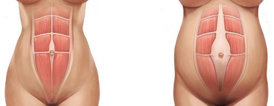 - A szülés után: kétujjnyi vagy annál szélesebb renyhe és mély rés a has középvonalán, a linea alba területét nem képes feszesen tartani. Gyakran jellemzi előreeső hasfal és az érzés, hogy előre akarnak esni a belső szervek.