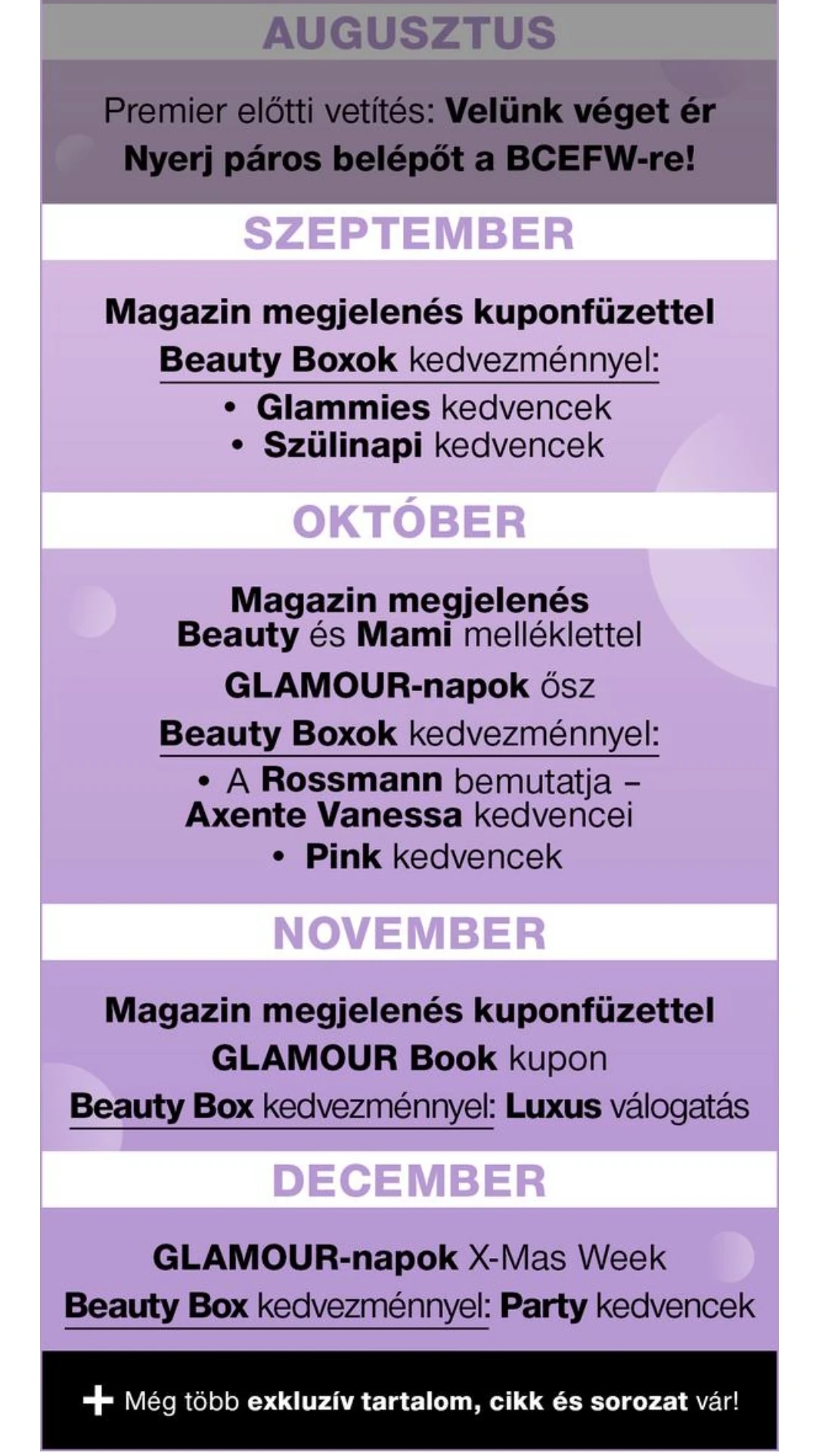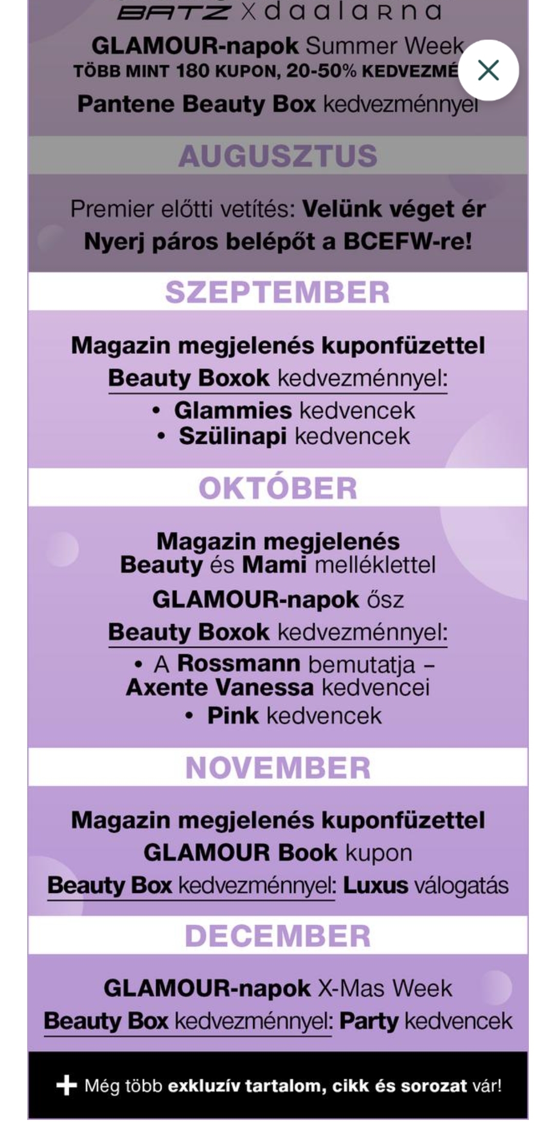A Főoldalon megtalálható a GLAMOUR+ naptár, ami magába foglalja a következő időszak legjobban várt eseményeit, így mindig tudni fogod, hogy mi vár rád GLAMOUR+ előfizetőként. A képre kattintva az év legjobban várt eseményeit és akcióit is láthatod, ha szeretnél még előrébb tervezni.