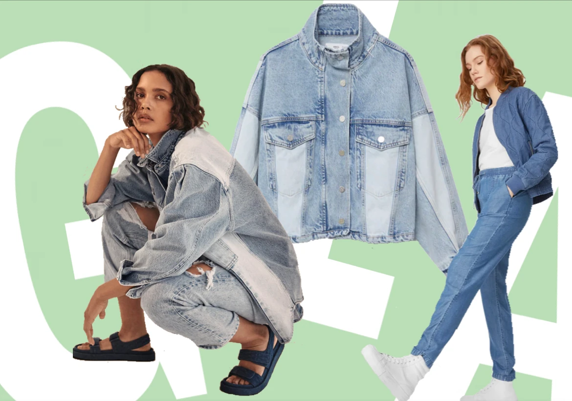 Eco wash technológiával, fenntartható pamut és 20% újrahasznosított farmer alapanyagból készült oversized patchwork-mintás dzseki és magas derekú nadrág MANGO shop.mango.com 15995 Ft, 15995 Ft; Steppelt minikabát és gumis derekú nadrág a C&A #wearthechange kollekciójából c-and-a.com